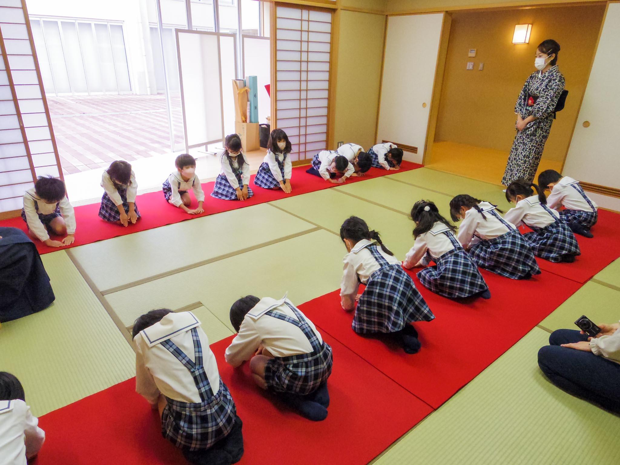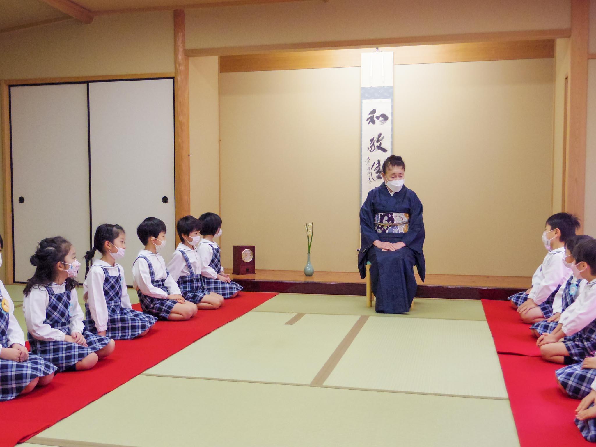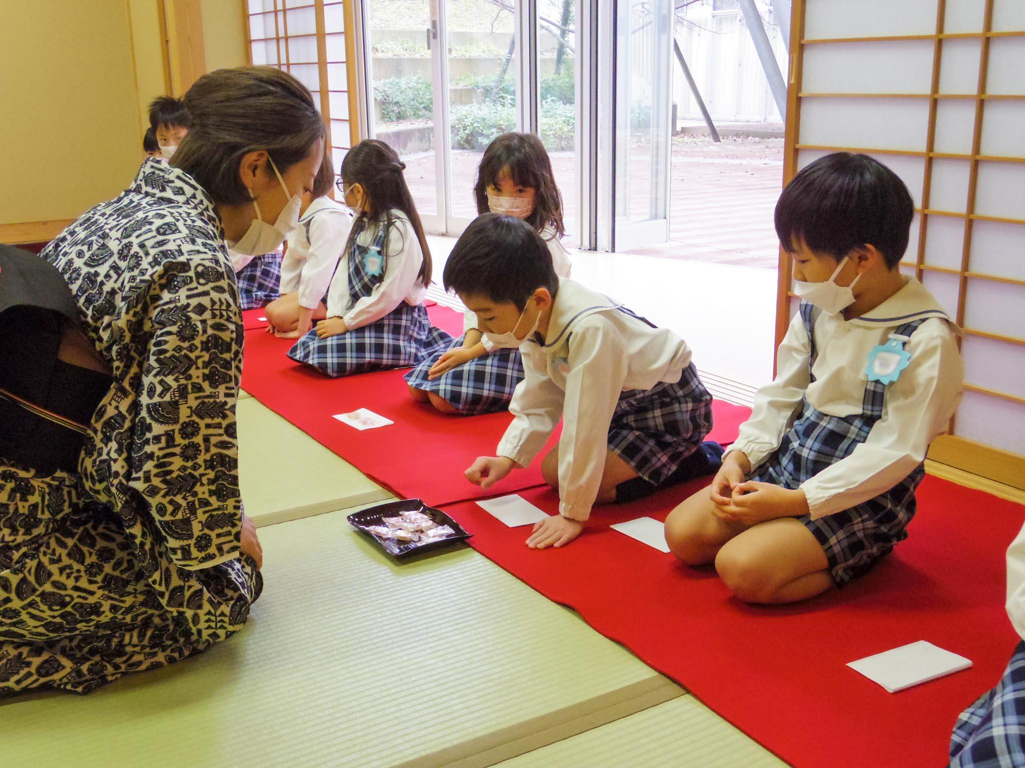 1月16日(月)、年長児が礼法を学びました。裏千家の赤木宗好先生に立つ・座る・歩くの所作や、お菓子を取る際のお作法を習いました。