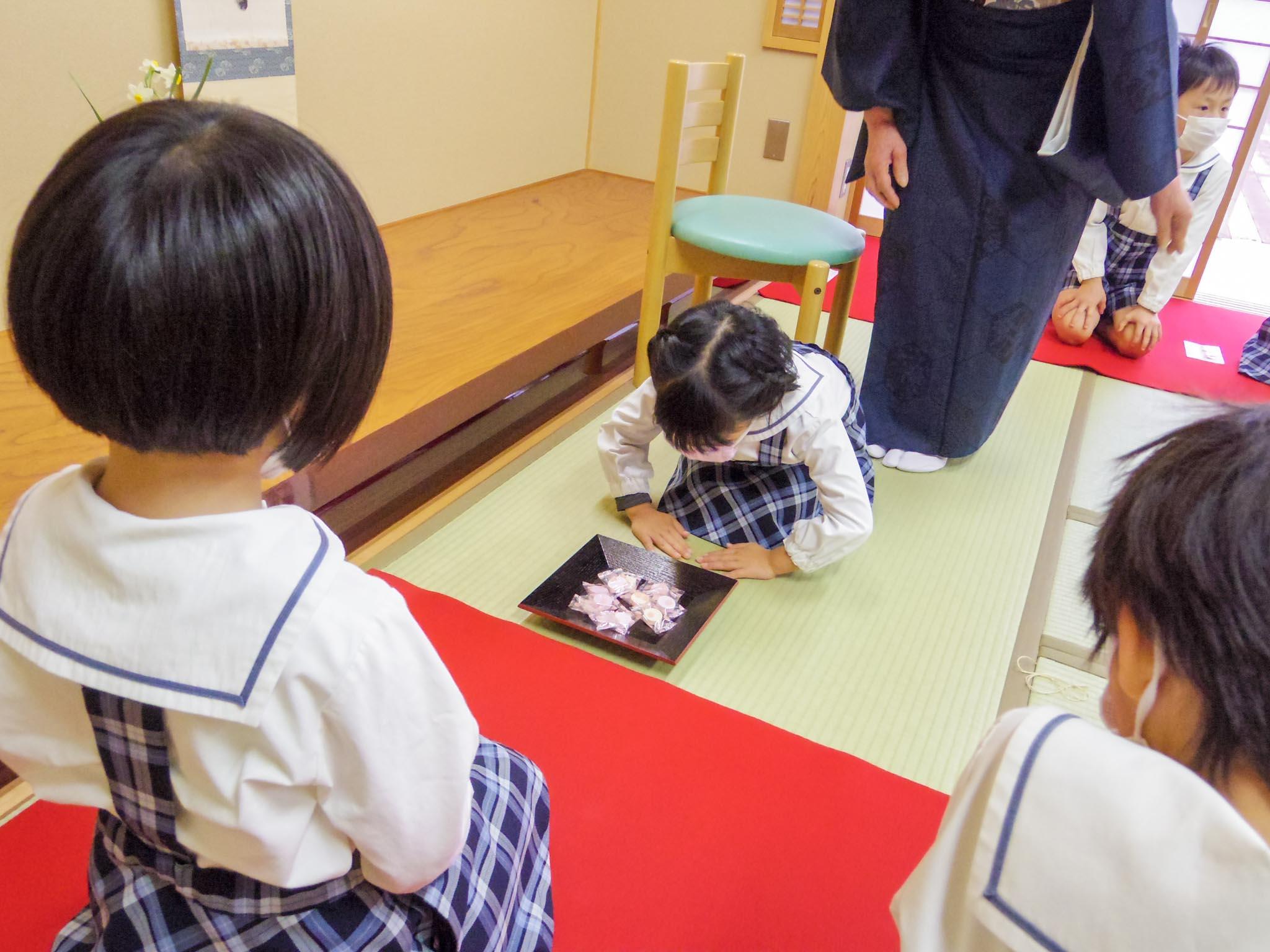 この日は新しく、お菓子の振る舞い方や取り方を学びました。代表の園児がお菓子を載せたお盆を運んで一人の前に起き、一礼して「お菓子をどうぞ」ともてなします。お盆が回ってきた園児は隣へ「お先に頂戴いたします」と声を掛け、「どうぞ」と勧められると、「お菓子を頂戴いたします」と挨拶して懐紙の上へお菓子を取りました。こうして順番にお盆を回していきます。