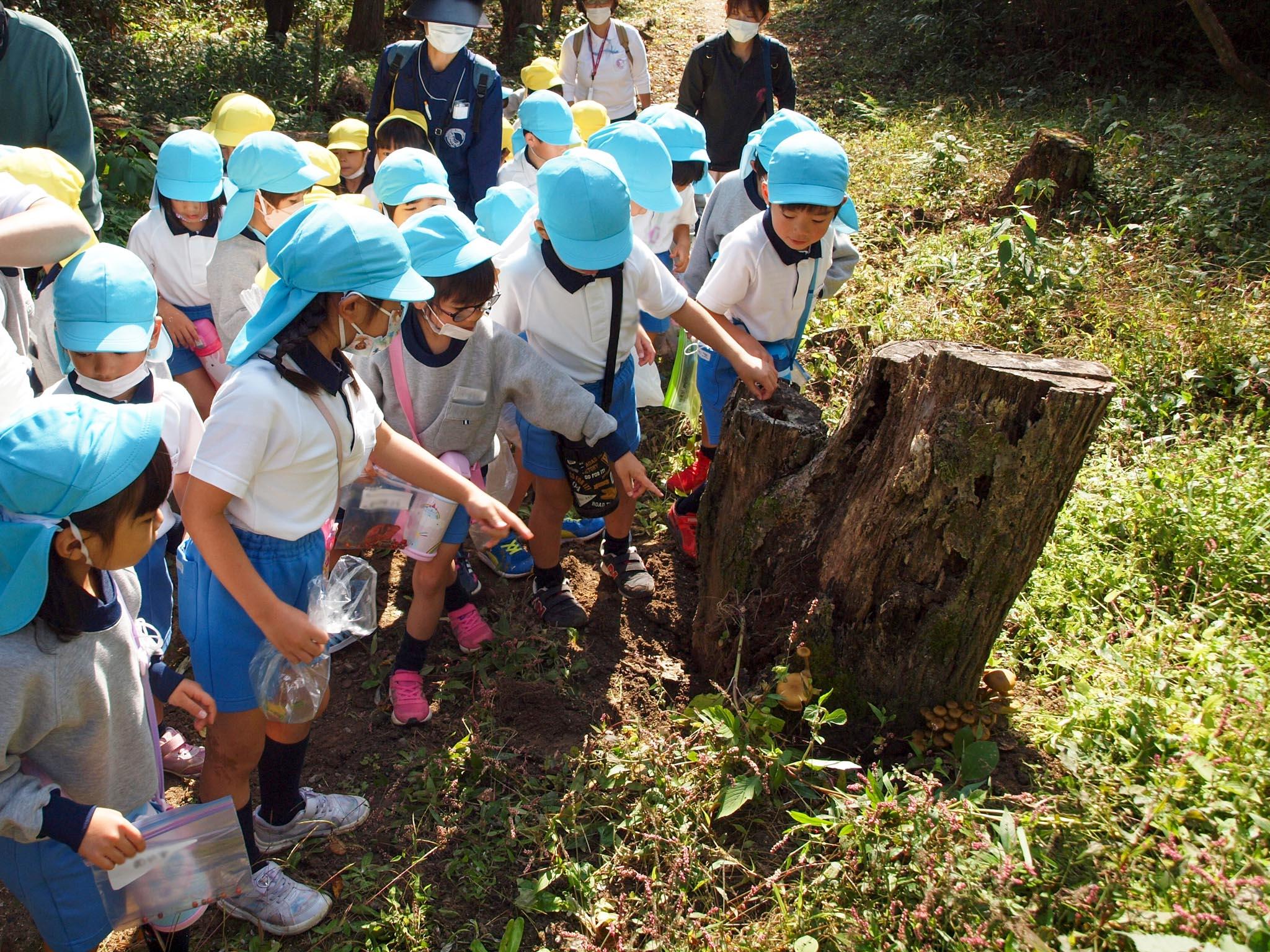 最初に、NPO法人里山サロンの久保先生から、これから行く森での過ごし方の注意を聞いてから、むろいけガイドウォークに出かけます。途中、大きなカリンの実を見つけたり、山の芋と呼ばれているムカゴを久保先生から教えてもらったり、ローリエの葉の香りを嗅いだり、ソヨゴの赤い実を拾ったり、たくさんなっていた冬イチゴの実を食べたり、森の中を歩いていると、たくさんのうれしい発見があります。木の根元にはサルノコシカケが生えていて、「腰かけてみてください!」と、久保先生から言われると、ほんとうに腰掛けられるのかどうか園児たちは硬さを確かめて、その硬さに不思議そうにしていました。ガイドウォークの最後には、今日の工作に使うドングリの実もしっかり採って帰ってきました。