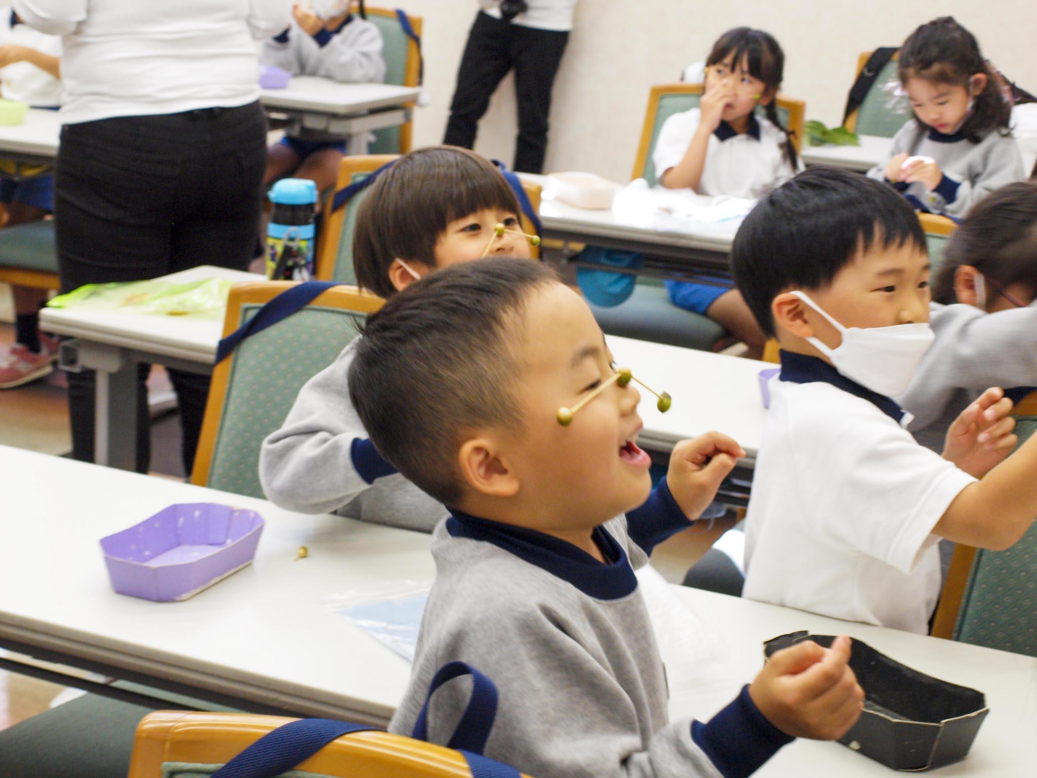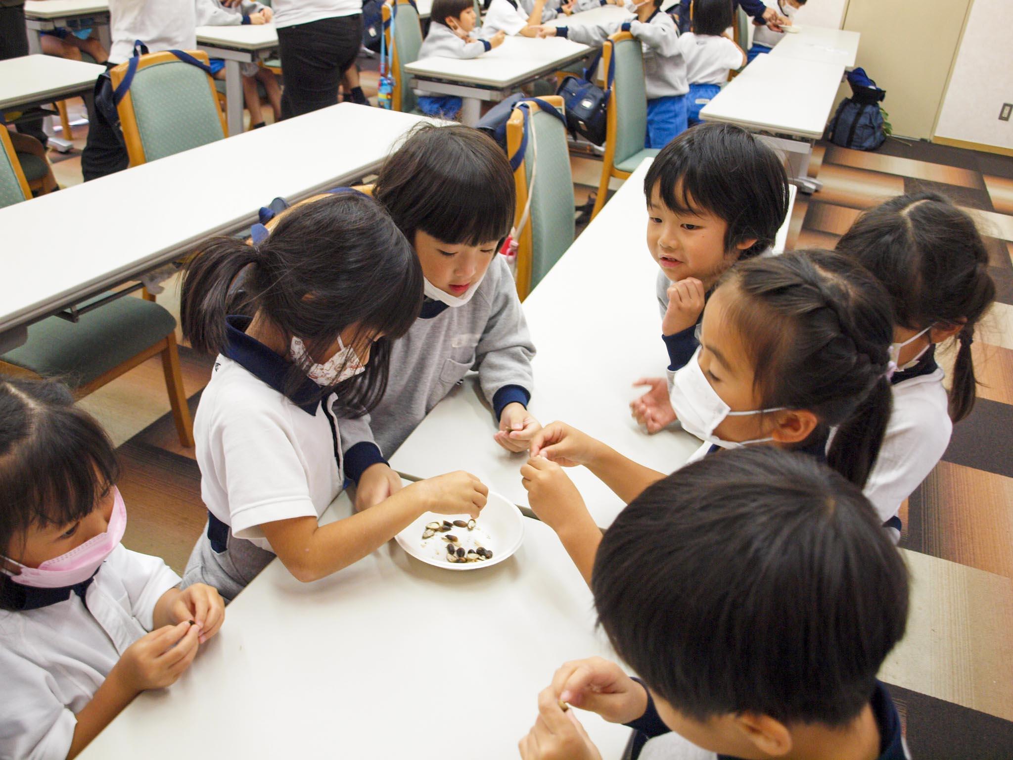 お昼ごはんのあとは、ドングリを試食してみます。まずは、スダジイのドングリを久保先生に炒ってもらって食べました。少しカシューナッツに似た風味で、園児からも「おいしい!」と声が上がります。続いて、マテバシイのドングリです。こちらは油を多めに入れて炒めて塩をまぶします。このドングリも美味しく、園児たちはドングリを全部たいらげていました。