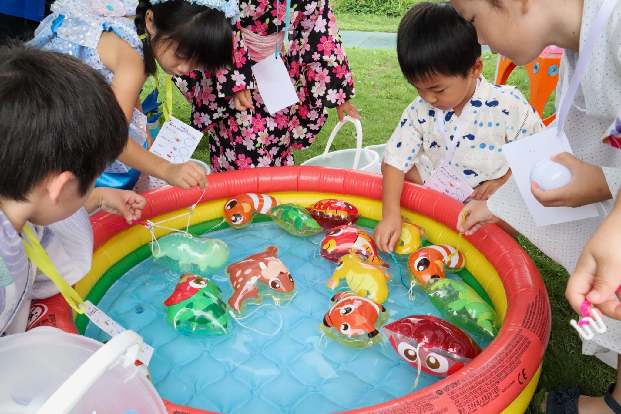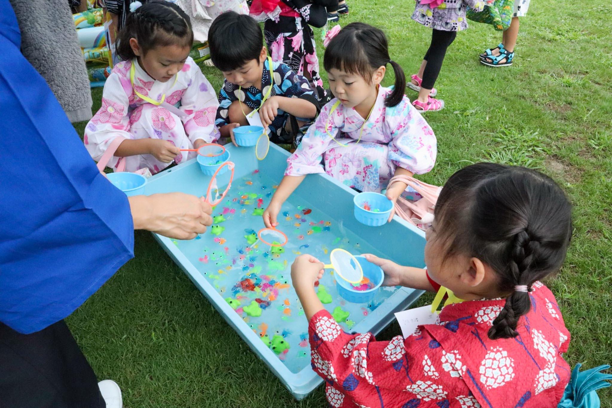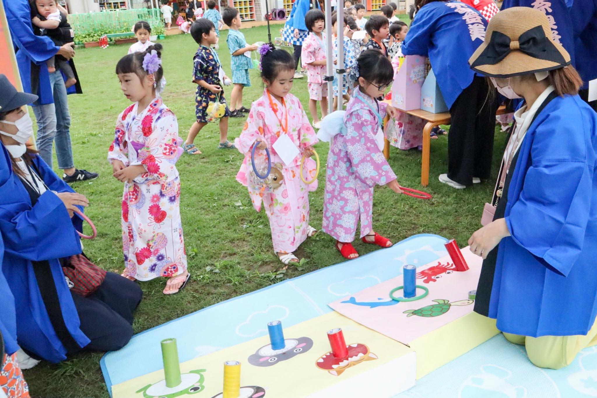 園庭には金魚すくいやヨーヨーつり、わなげ、そして何が出てくるのかワクワクするお楽しみコーナーなどが並んでいました。