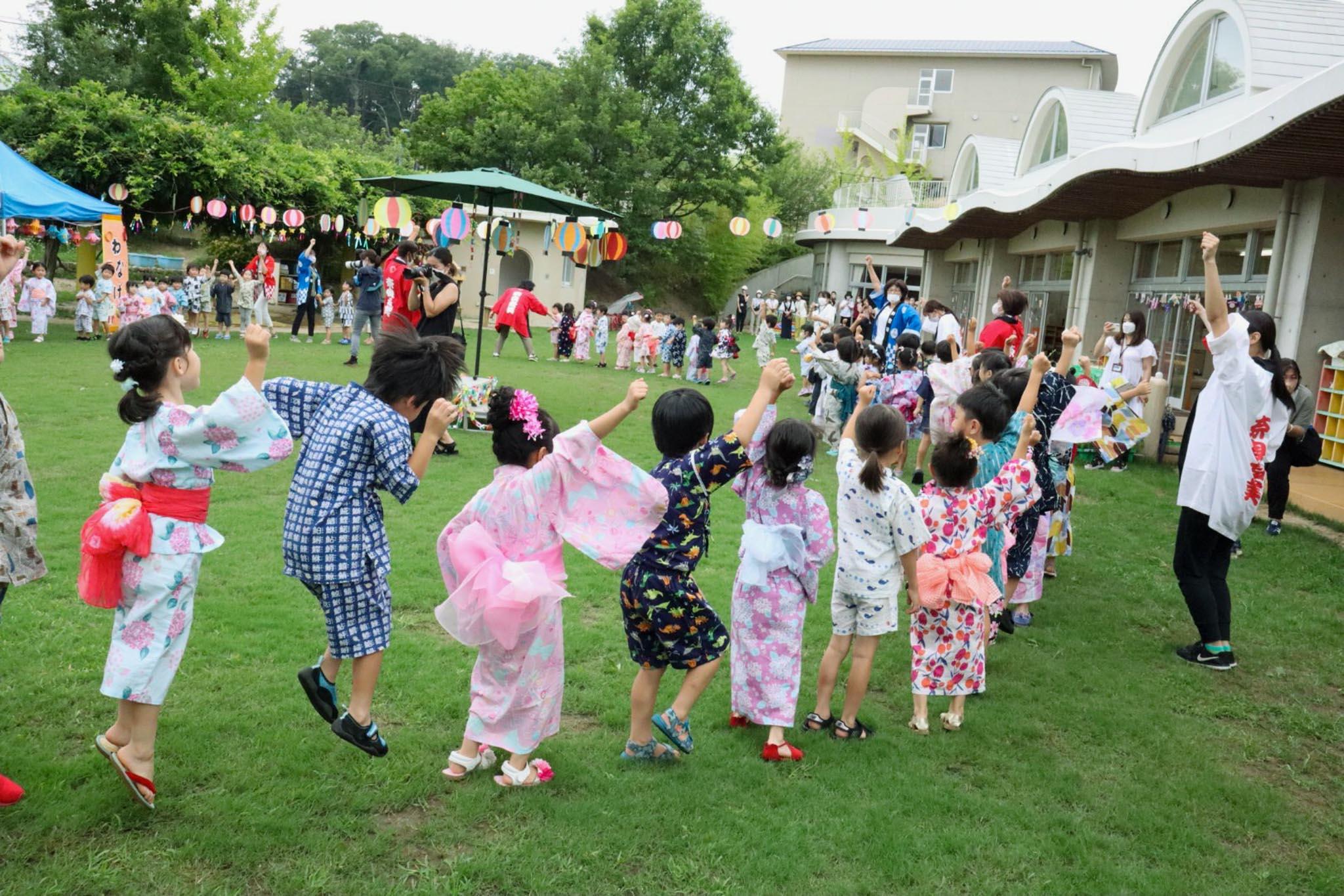 7月8日(金)、昨日までの雨のおかげで芝生の緑が映える園庭で夏祭りを行いました。