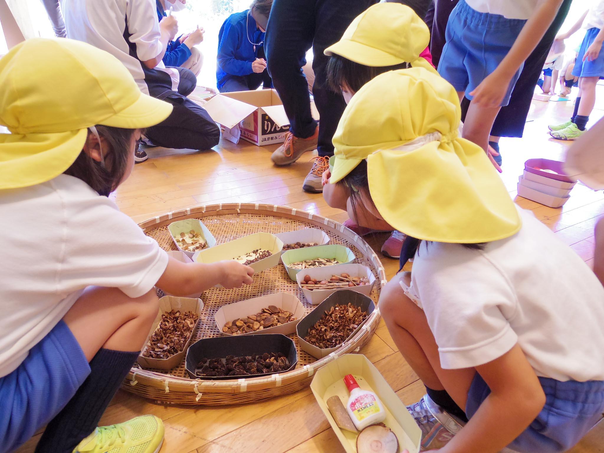 次は工作教室です。森で集めた木の実や枝、葉っぱなどを使って作品を作ります。子どもたちはどんな作品にしようかと想像をめぐらせながら、木工ボンドでひとつひとつの部品を取り付けていました。