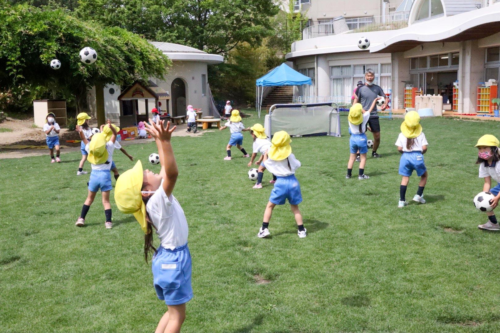 年中組の頃には、サッカーボールをうまくキャッチすることができませんでしたが、さすが年長組ともなると、両手を大きく広げてしっかり受け止めることができるようになりました。さらに、落ちてきたサッカーボールを膝やお尻、お腹で止める練習をしました。