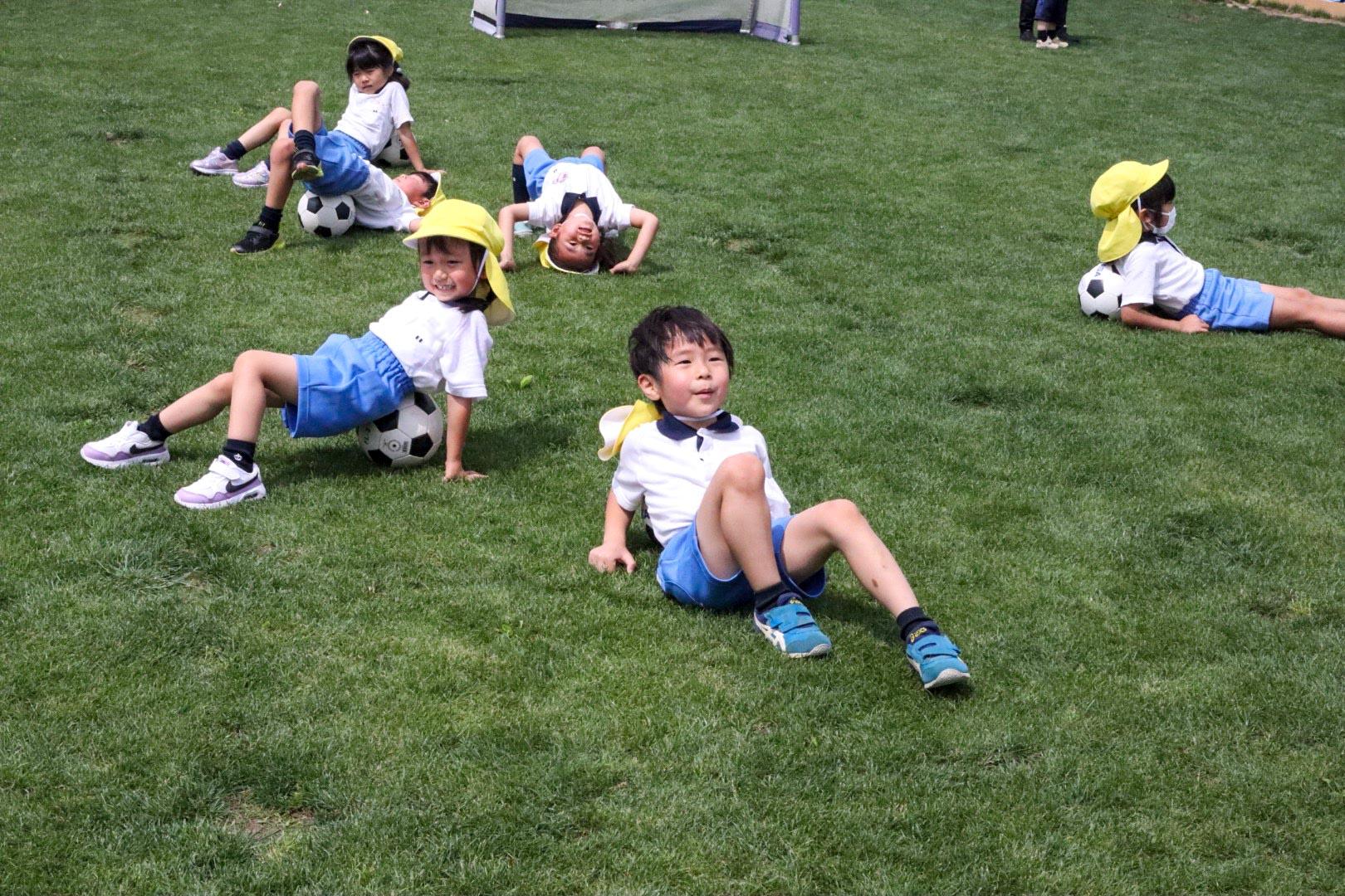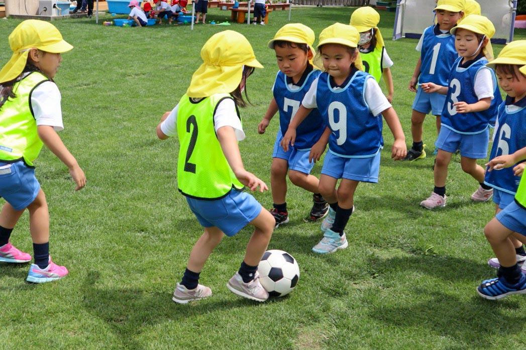 園庭の芝生のピッチに先生がサッカーボールを投げ込むなり、両チームの選手が猛烈な勢いでそれを追い、取ったり取られたりの大激戦がスタートしました。