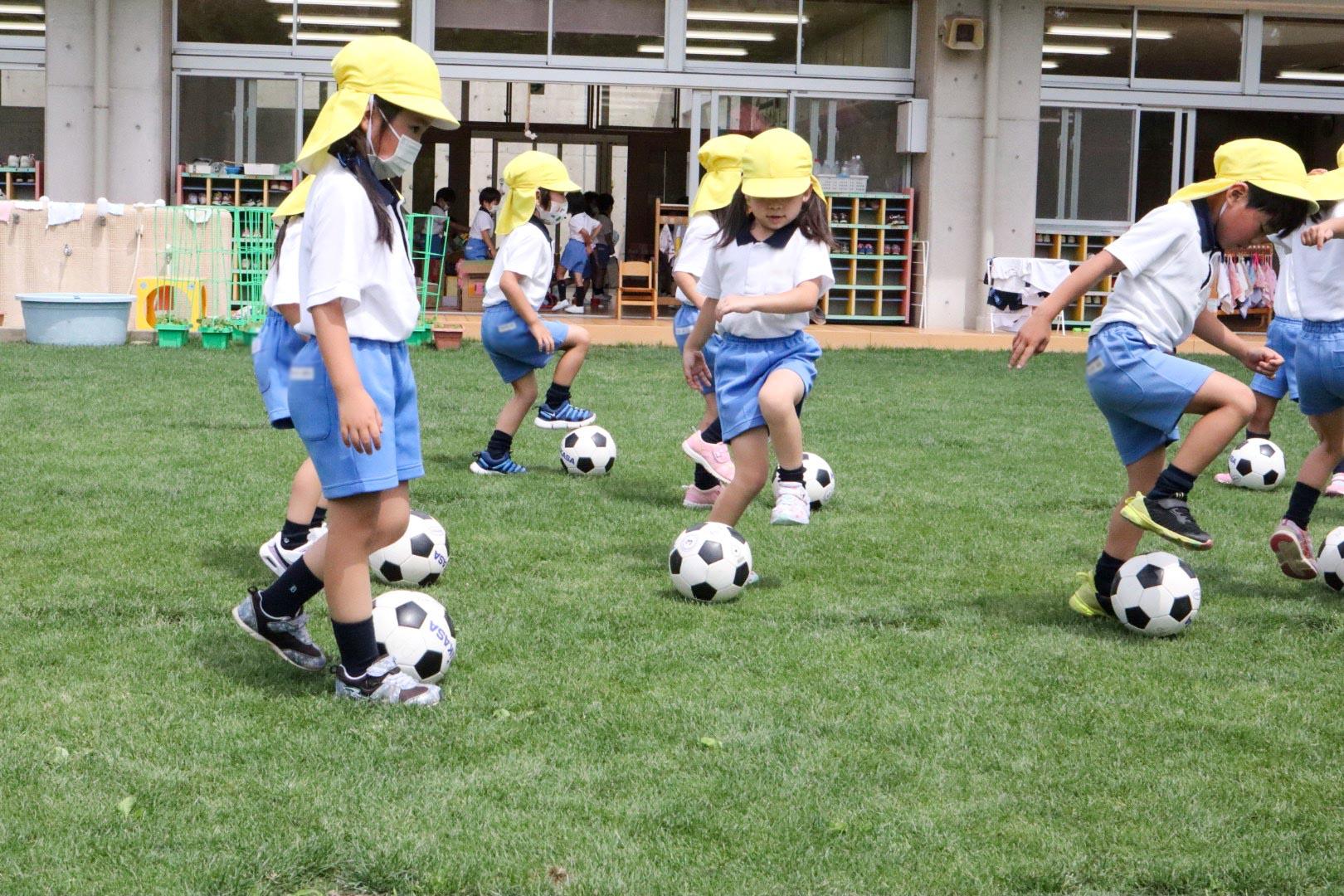 やがてパスでつなぐ連携プレイでゴールを目指す技も身につけ、広い園庭をいっぱいに使っての白熱した試合展開となりました。
