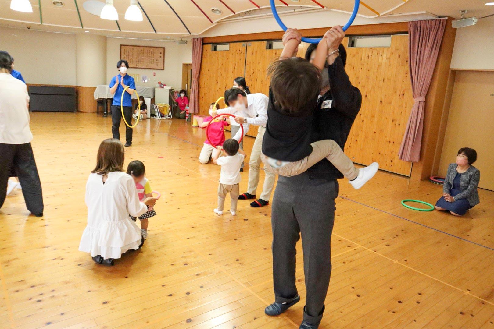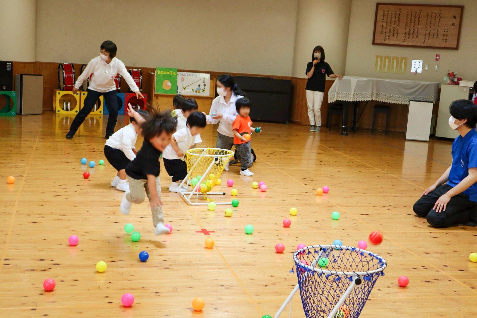 今度は遊戯室に移動し、「どうぶつクイズ」をしながらウサギさん、ゾウさん、ゴリラさんのまねっこ体操をして遊びました。また、「よーいドンのかけっこ」では、ゴールにむかって一直線に走りました。フープを使っての電車ごっこやカラーボールを投げたり蹴ったり、玉入れをしたりする、楽しそうな子どもたちの笑い声が遊戯室に響いていました。
