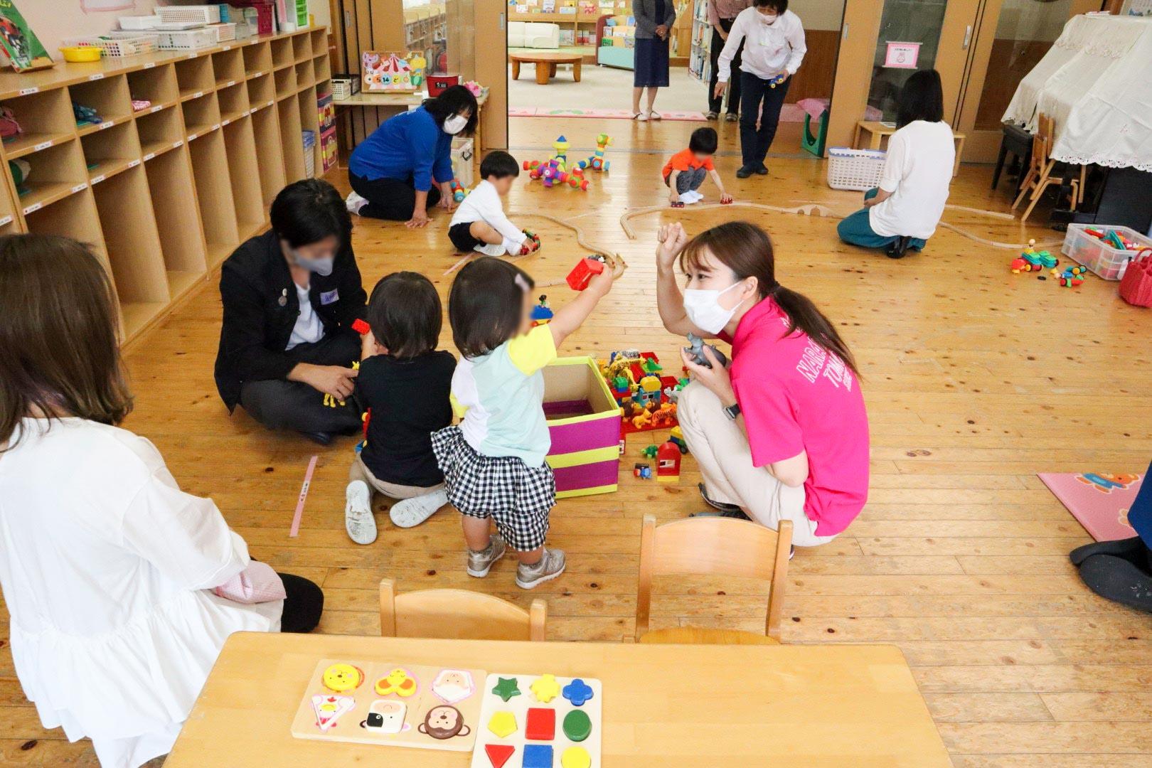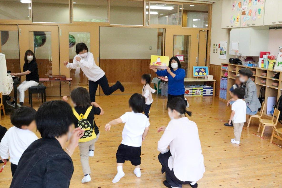 まずは、自由遊びです。子どもたちは保育室で、おままごとや積み木、パズル、人形遊びやボール当てごっこなどで好きな遊びを楽しんでもらいました。みんなでお片付けをしたら、次は絵本『みんなでたいそう』の読み聞かせをしました。子どもたちは絵本の物語に合わせて、うさちゃんやぶたくん、へびさんになって、一緒に体操をしました。