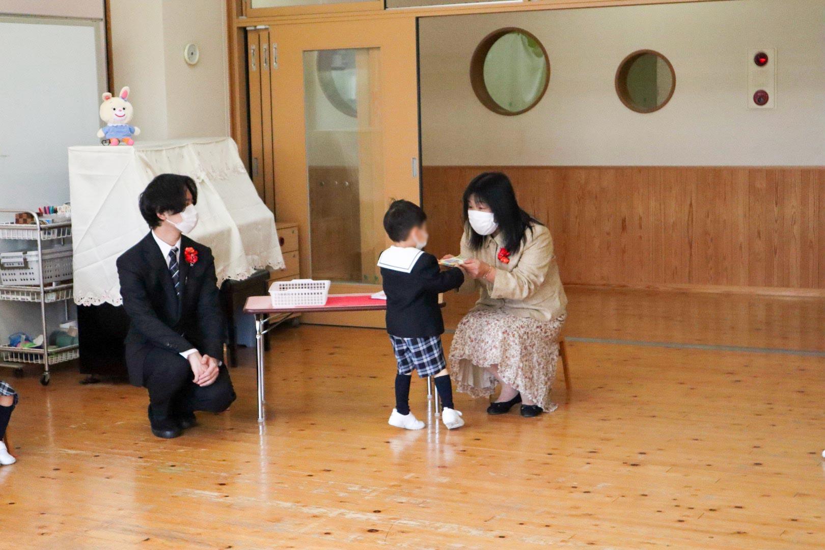 まず、担任の先生から一人ひとりの名前が呼ばれると、新入園児たちは元気に「はい!」と元気に返事をし、園長より入園を許可されました。奈良学園幼稚園に新しいお友だちの誕生です。