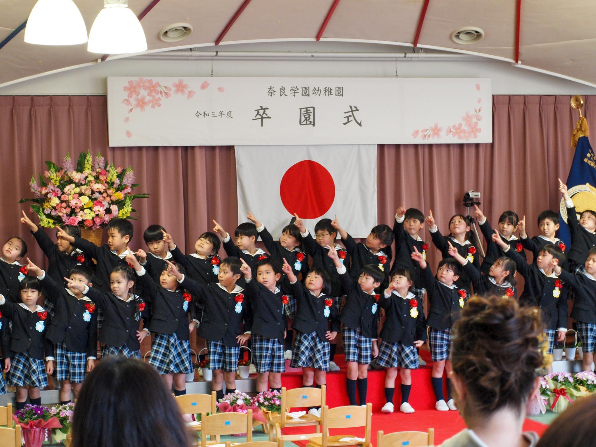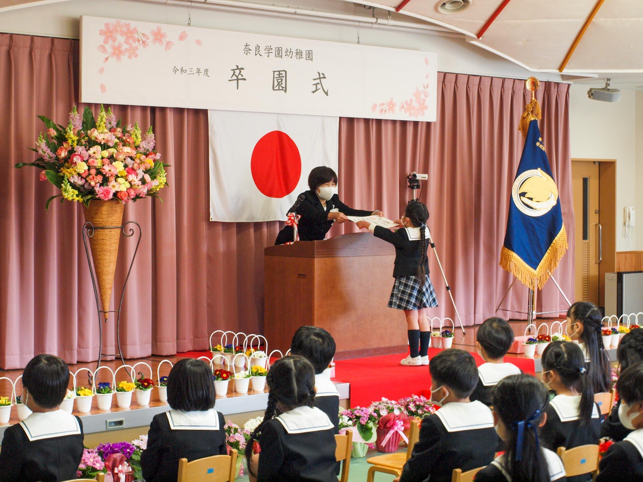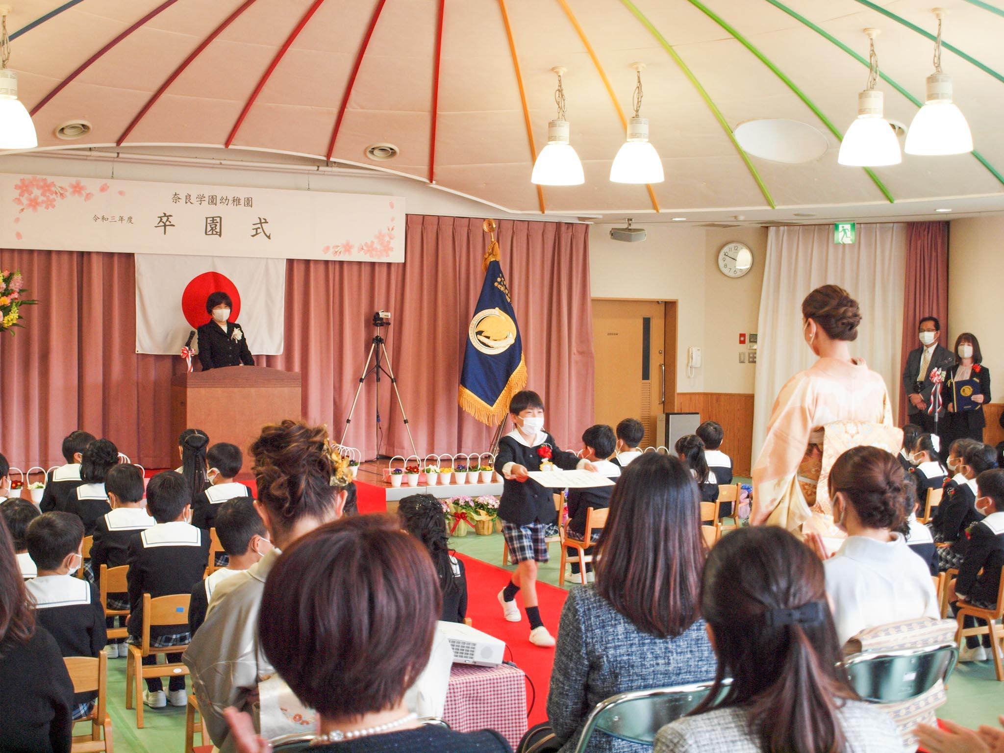 谷川園長が式辞で、「最初は出来なかったことが出来るようになっていく姿を見るのがとっても嬉しかったです。親子でホタル観察をしたり、生駒遊園ではおもいっきり水遊びをしたり、いっぱい思い出もつくりました。運動会や演奏会などの行事では、あきらめずに仲間と力をあわせて頑張る楽しさを学びましたね。これからも、みんなに『ありがとう』と言ってもらえる子になっていってくださいね」と話すと、卒園児たちは大きな声で「はい!」と返事をしていました。