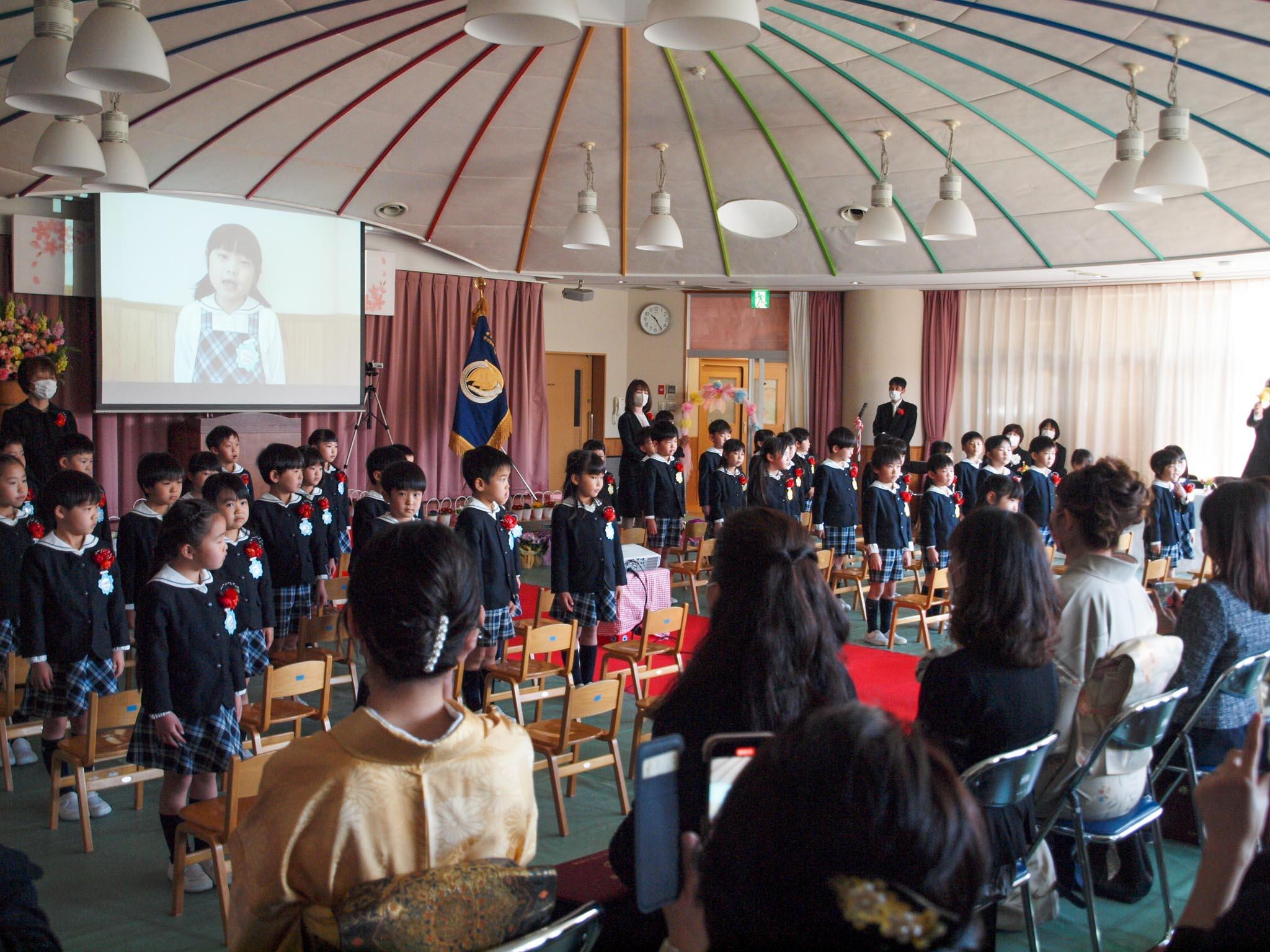 年長組の52人が堂々と胸を張り入場し、開式の辞の後、みんなで園歌を黙唱しました。