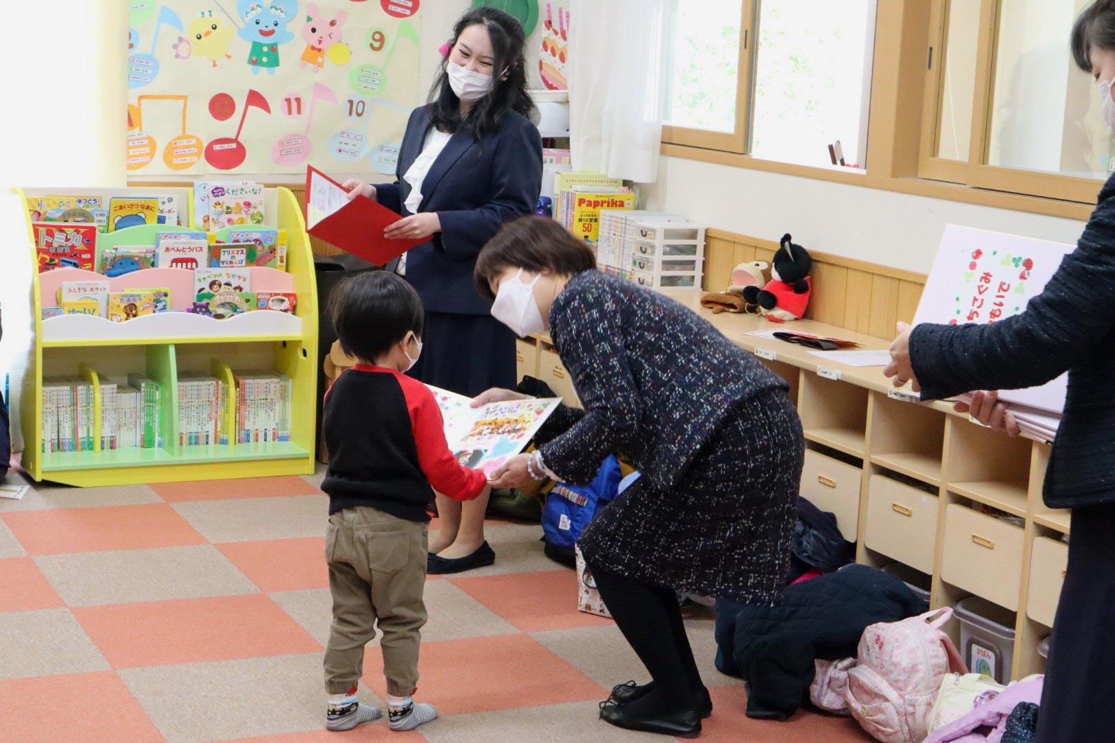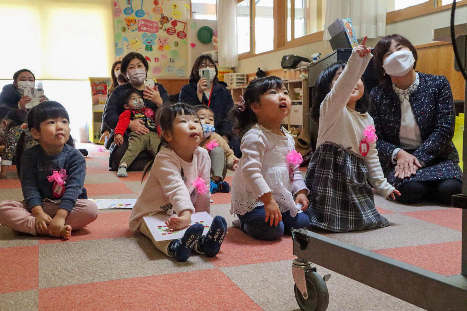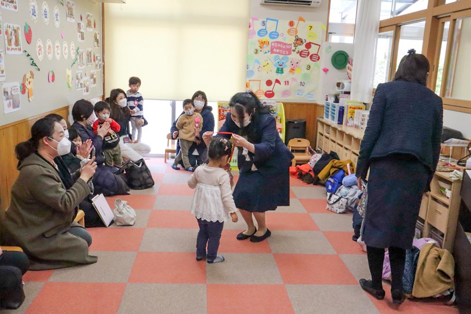 次に、子どもたち一人ひとりの名前が呼ばれ、担任の先生手作りの終了書が園長から手渡されました。続いて、楽しかったいちご組での思い出のスライドが上映され、子どもたちからは、モニターの中の自分の姿を見つけると指さして大喜びをしていました。