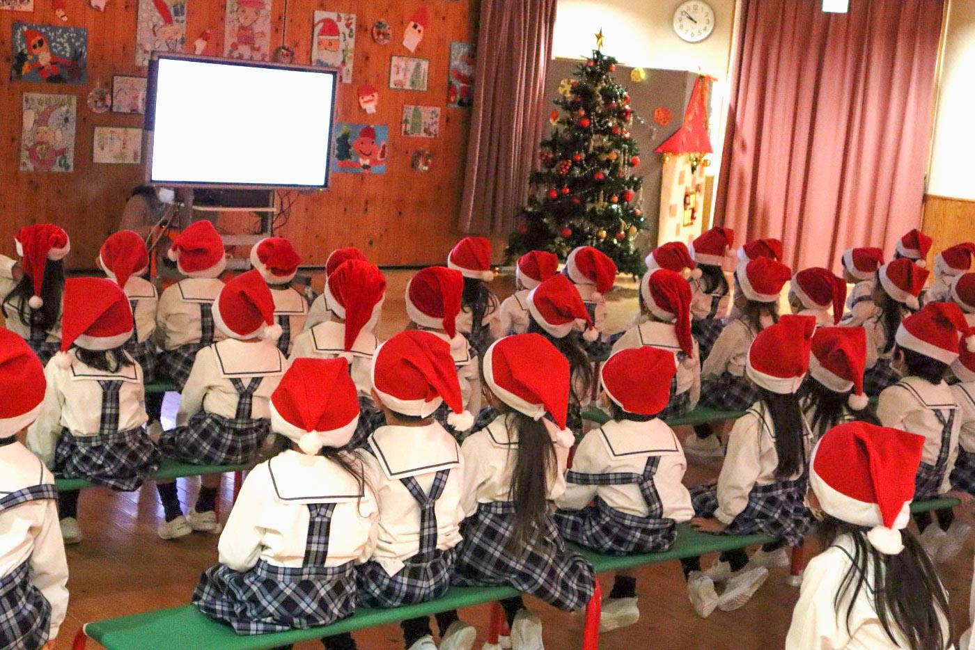 サンタ帽をかぶり笑顔いっぱいの園児たちは、谷川園長のお話を静かに聞いた後、みんなで『赤鼻のトナカイ』を歌いました。「みんなの歌、サンタさんに届いたかな。みんなの歌を聴いて、来てくれるといいね」と先生たち。次に、モニターで『ねこのピート』を観ました。物語が終わる頃に、どこからともなくシャンシャンシャンと鈴の音が聴こえてきました。