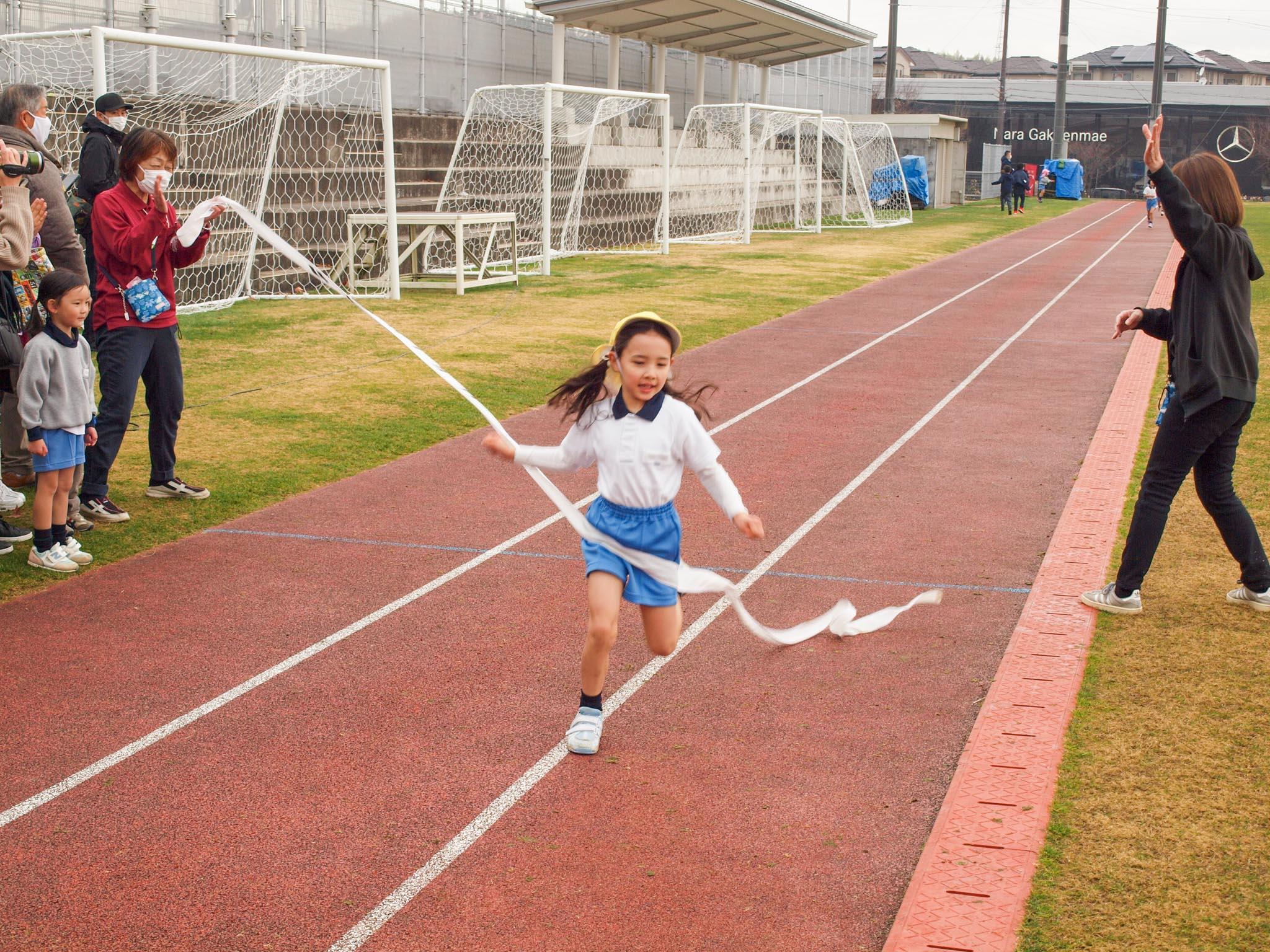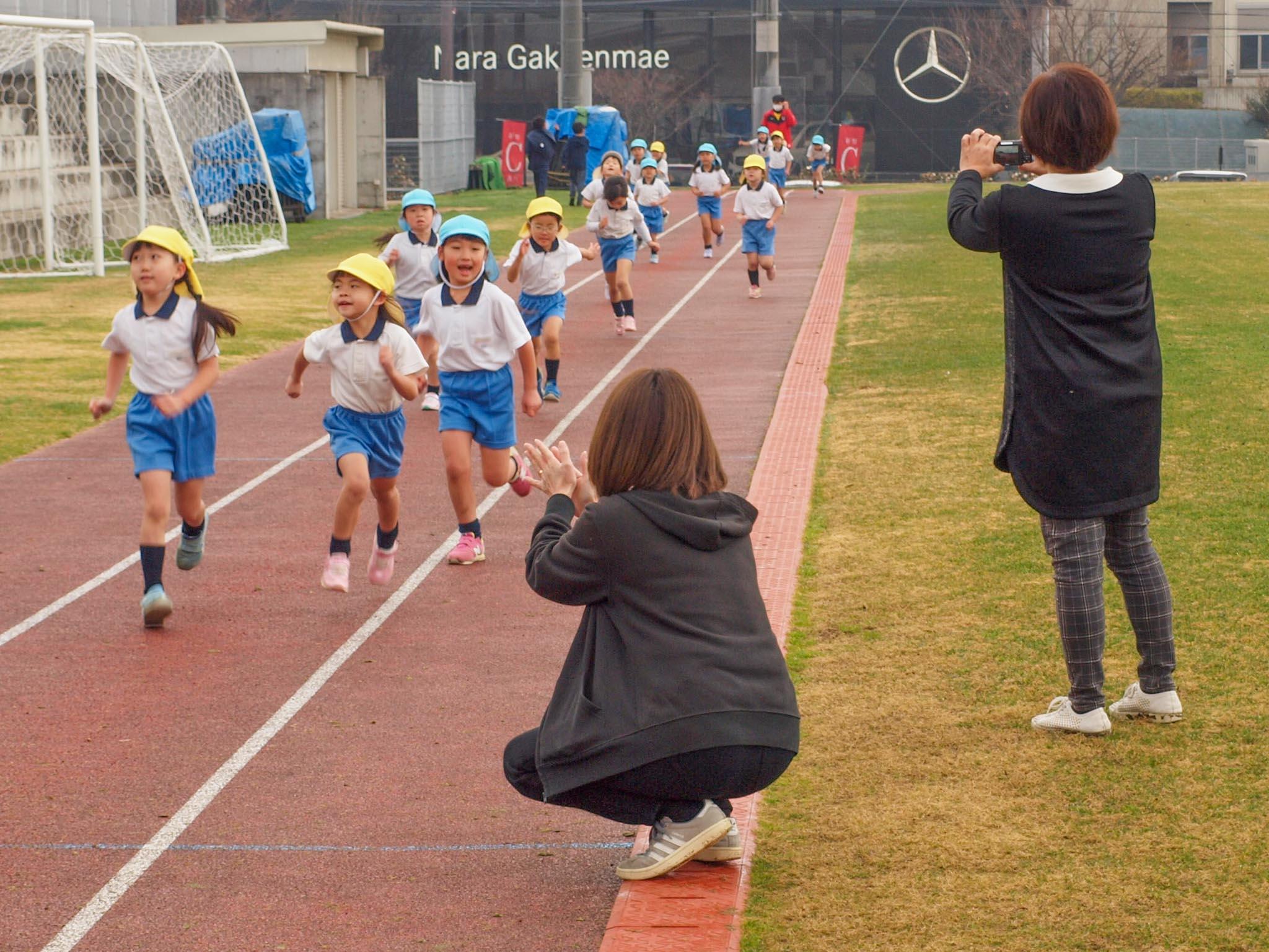 途中、諦めそうになる年少の園児には、先生が伴走して一緒にゴールし、年長の園児にはサッカー部のお兄さんが伴走しながら、「あと、1周!がんばって!」と声をかけてくれたり、たくさんの保護者の方々と、先にゴールしたお友達の「がんばれ!がんばれ!」という声援の中、最後まで諦めずに全員がゴールできました。