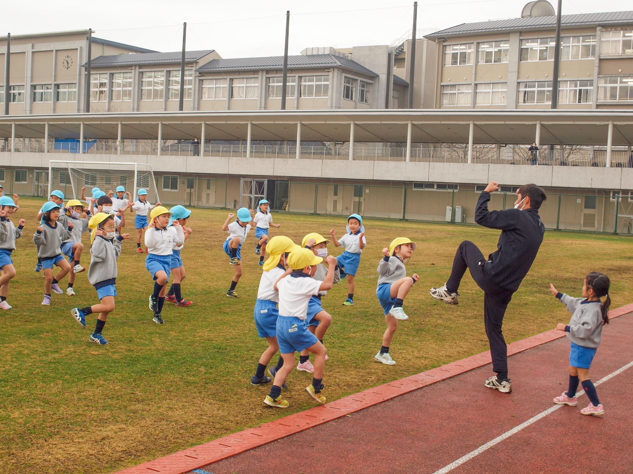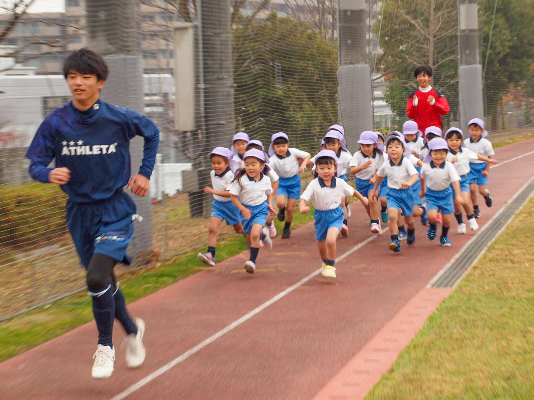 みんなが走り終わった後に、伴走をしてくれた中高のサッカー部のお兄さん達が、「みんな思っていたより速くて驚きました!」と感想を言うと、園児たちは大喜びで、「一緒に走ってくれて、ありがとう!」とお礼を返していました。