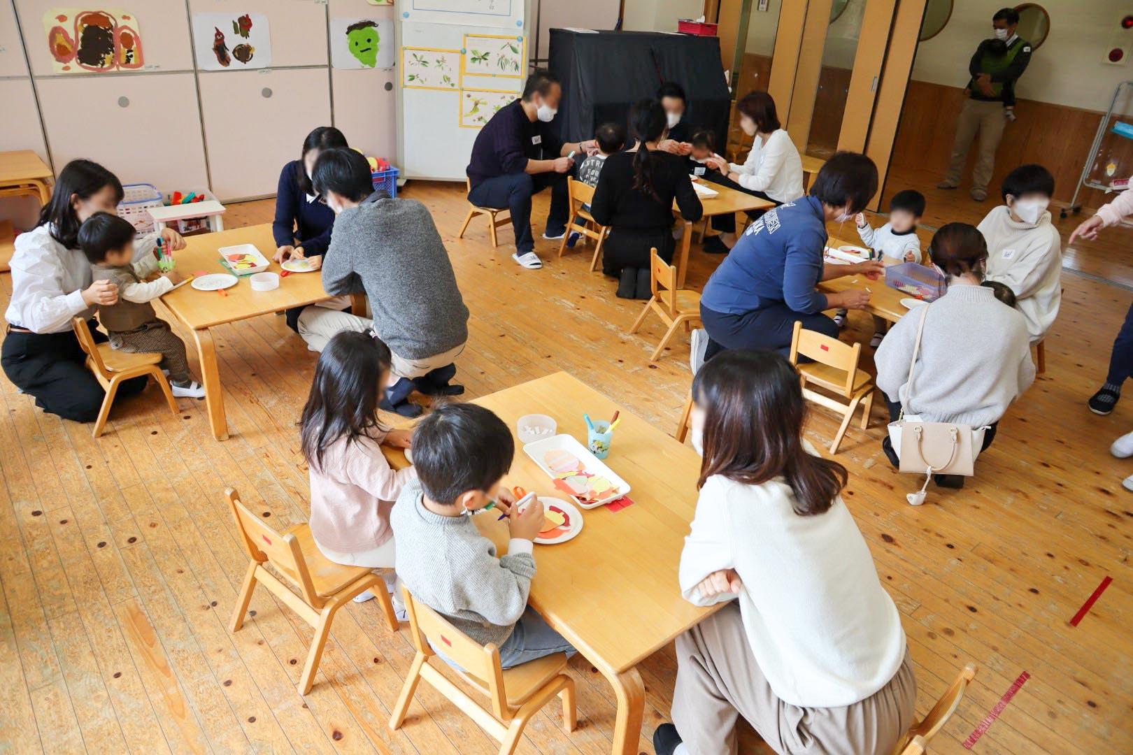 お部屋では先生から「どんぐりころころ」の絵本の読み聞かせのあと、お母さんやお父さんと、机に並べられたどんぐりや落ち葉の切り紙、シール、リボンを紙皿の上に貼り付けるどんぐり飾りを作りました。子どもたちが作ったどんぐり飾りはお家に持って帰るプレゼントです。