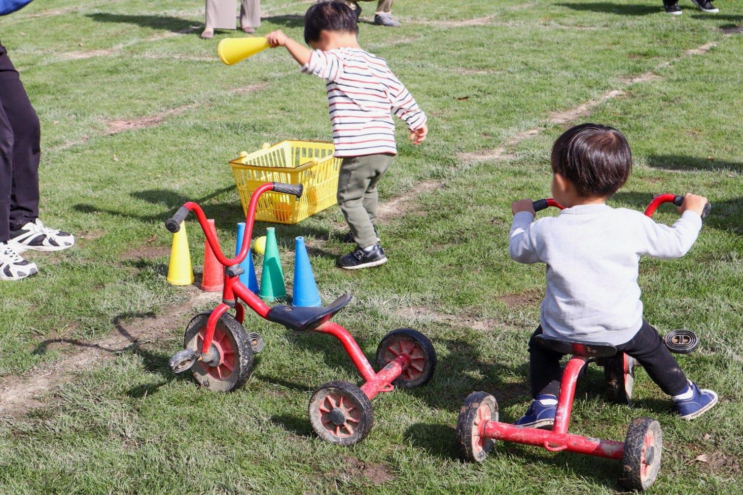 保育室でおままごとや大きな積み木など、園庭では、サッカーボールやフープ、三輪車で遊びました。また、仲良くなったお友だちと一緒に、落ち葉やどんぐり拾いをしながらお話を楽しんでいました。