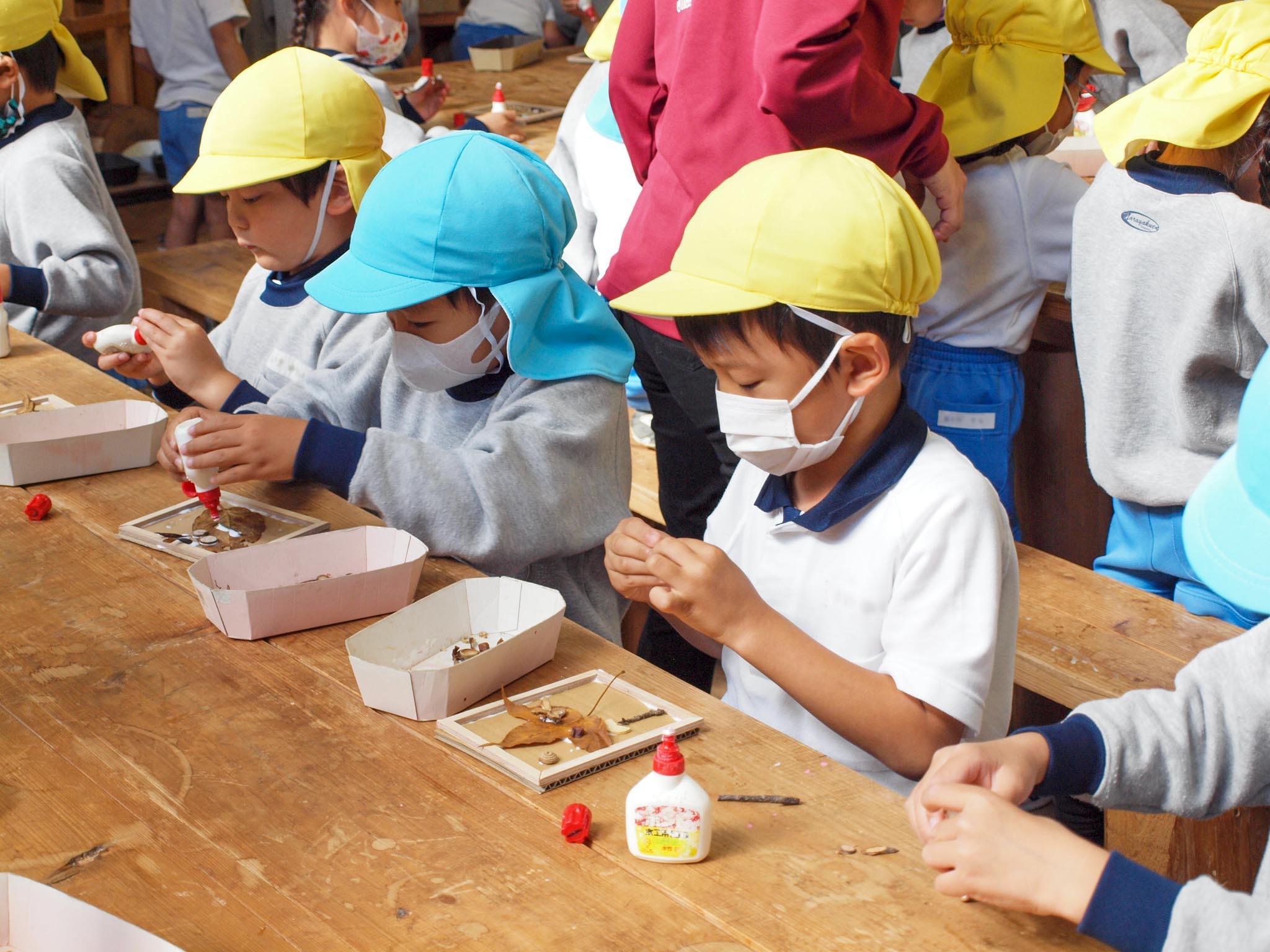 途中、どんぐりを拾ったり、山道の谷の両側にわかれて、ヤッホーと叫んだりして森の散策を楽しんだ後は、森の工作館に戻って、木の葉や実を使った額縁つくりです。子どもたちは、それぞれ個性的な作品を仕上げていました。