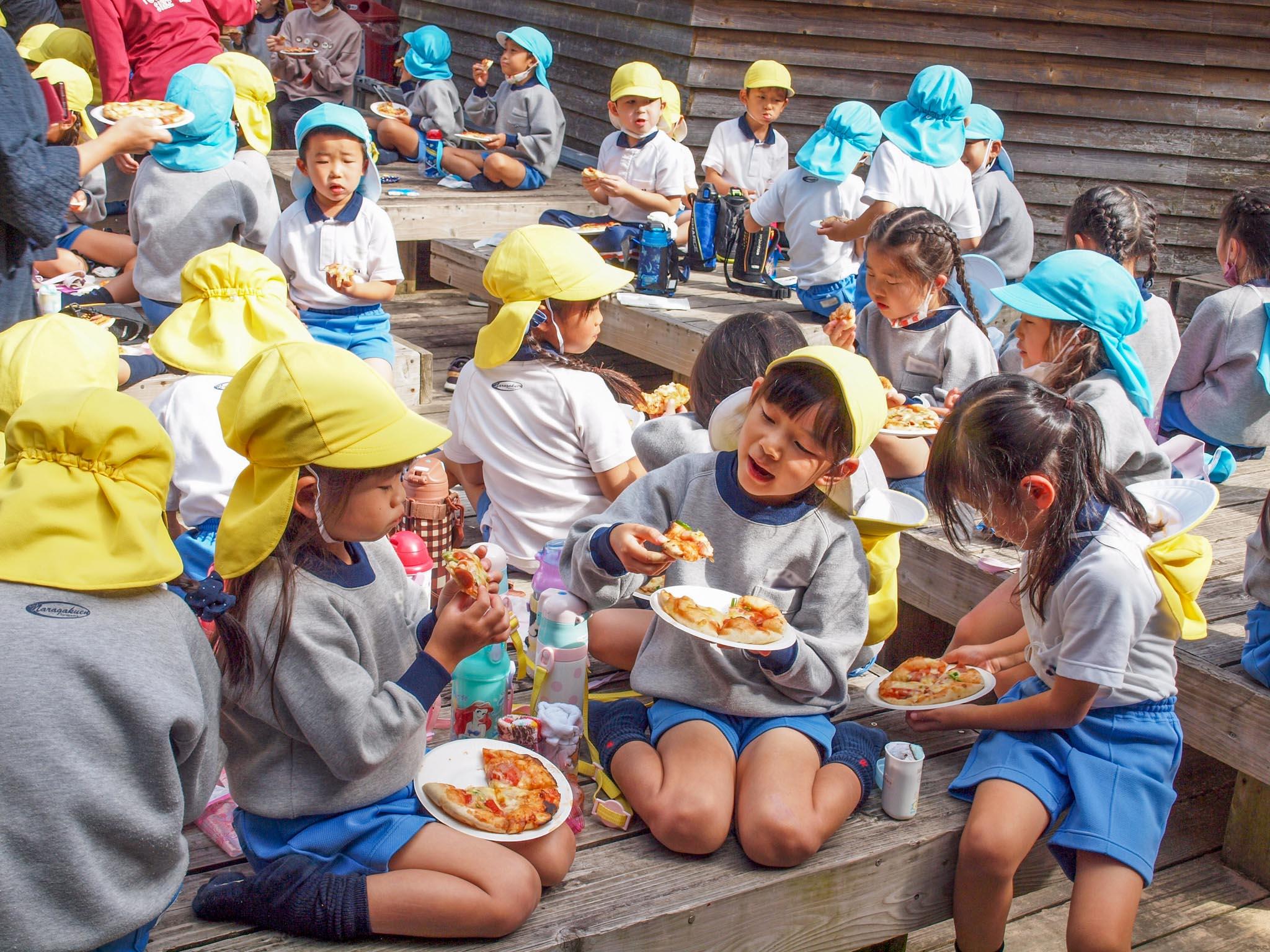 額縁を仕上げた後は、スタッフの皆さんが作ってくださったピザをいただきます。野外で食べる焼きたてのピザに、「美味しいね!」とはしゃぎながら、園児たちは皆笑顔になっていました。