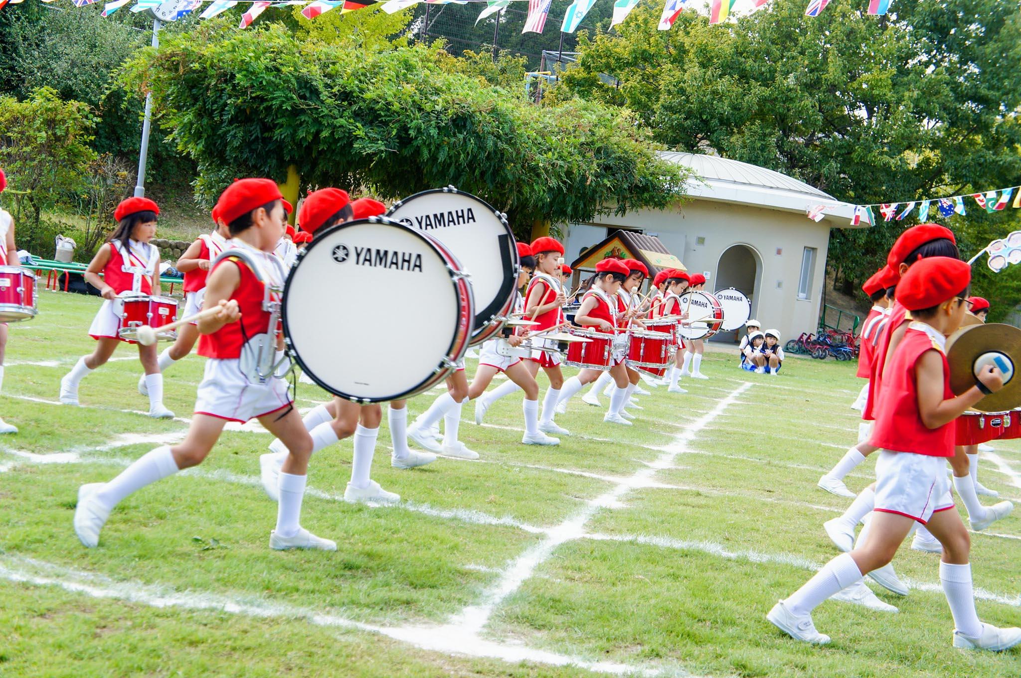 続いて、「奈良学園Pre-Primaryマーチングバンド」です。年長組の見事なドラムプレイに、観客席から手拍子が湧き起こりました。マーチングバンドに、年中組がフラッグとホイール、さらに年少組の子どもたちがポンポンを持って加わりました。全園児が笑顔いっぱいに日頃の練習成果を披露しましたも楽しそうにでした。