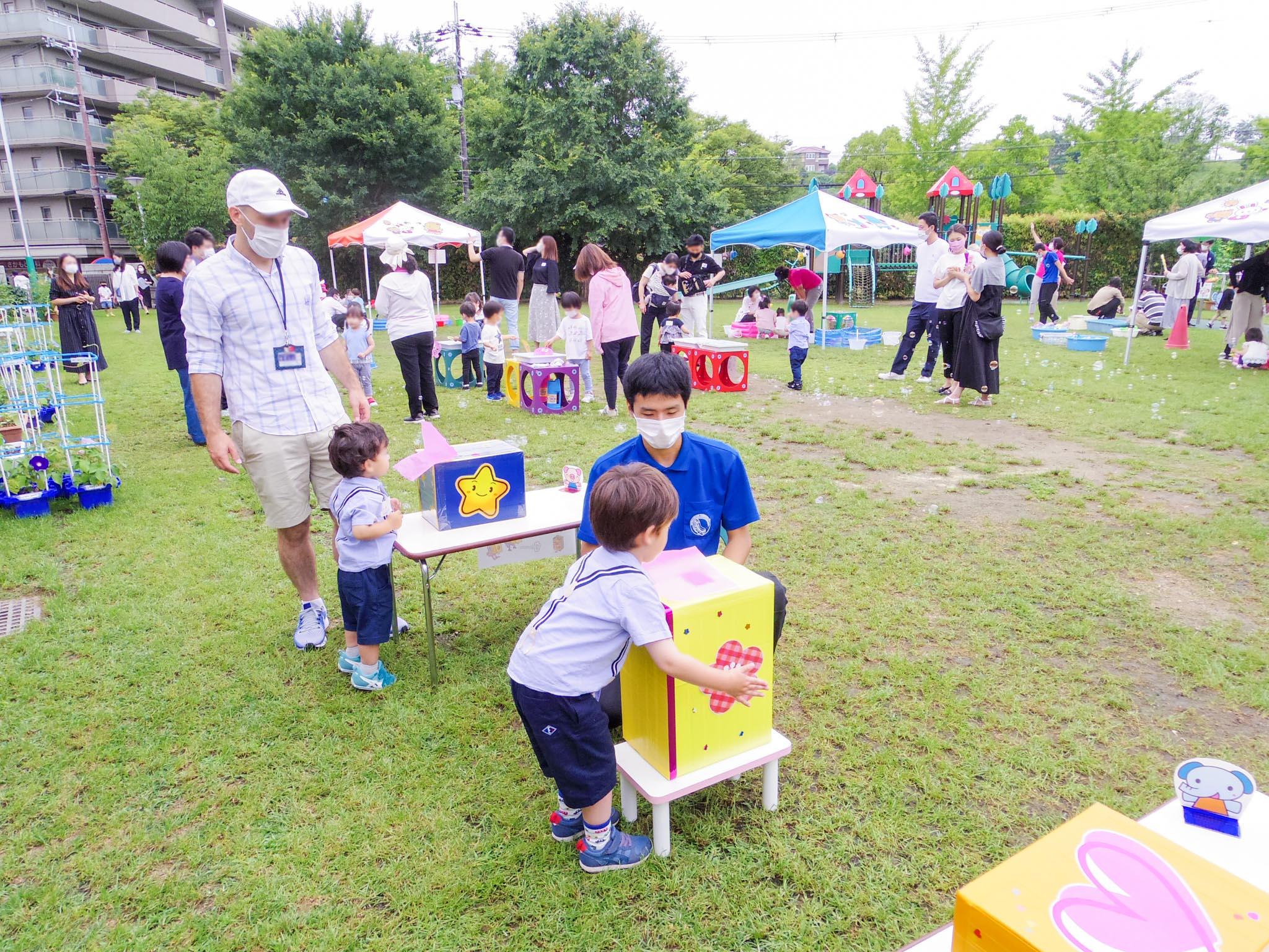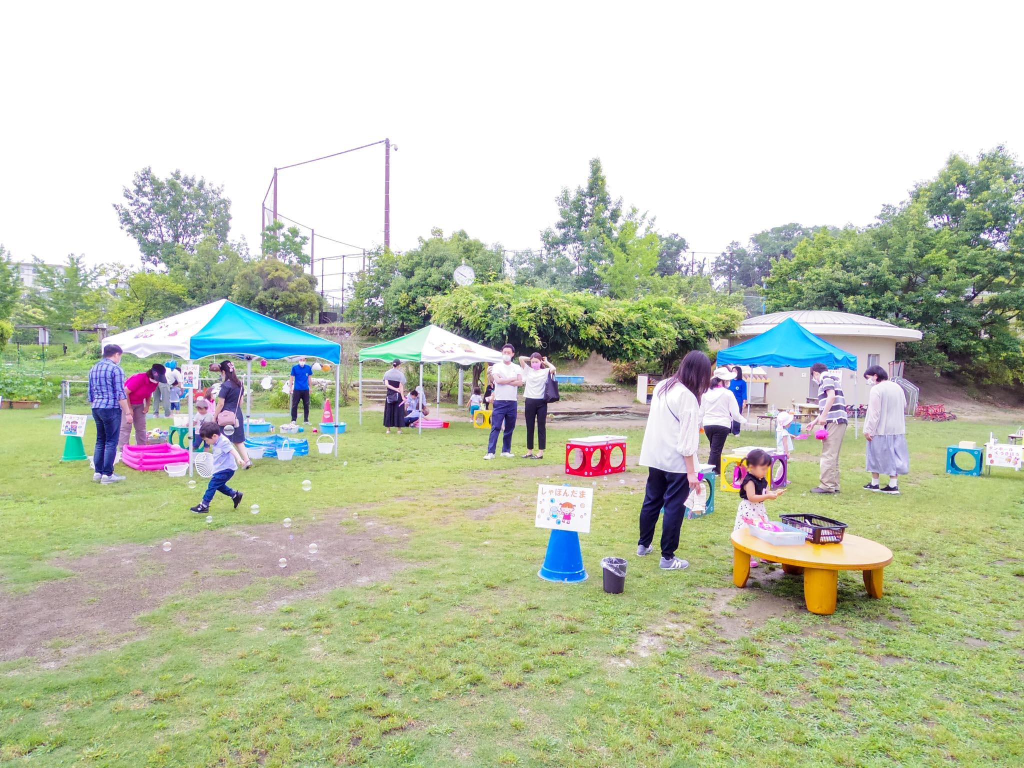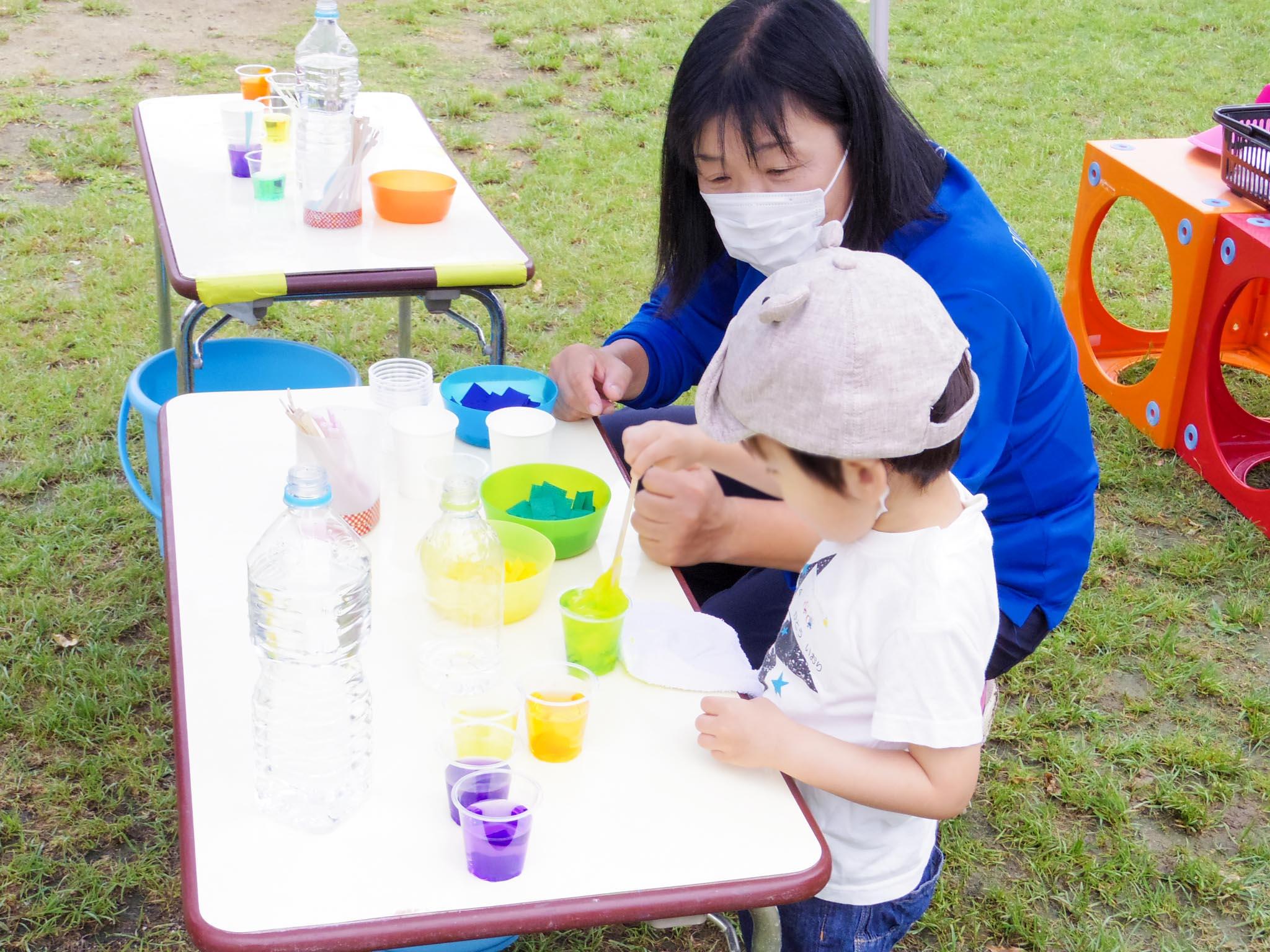 園庭にさまざまなコーナーを設けて自由に遊んでいただきました。水てっぽうで的あて、磁石仕掛けの魚つり、ヨーヨーつりにカエルすくい、色水あそび、段ボール空気砲など、夏祭りを思わせるたくさんの遊びに子どもたちは大はしゃぎ。しゃぼん玉は特に人気で、子どもたちはうちわ骨をしゃぼん玉液に浸してはふり、園庭をしゃぼん玉でいっぱいにしていました。また、すべり台や棚田の探検を楽しんでくださったお子さんもいました。