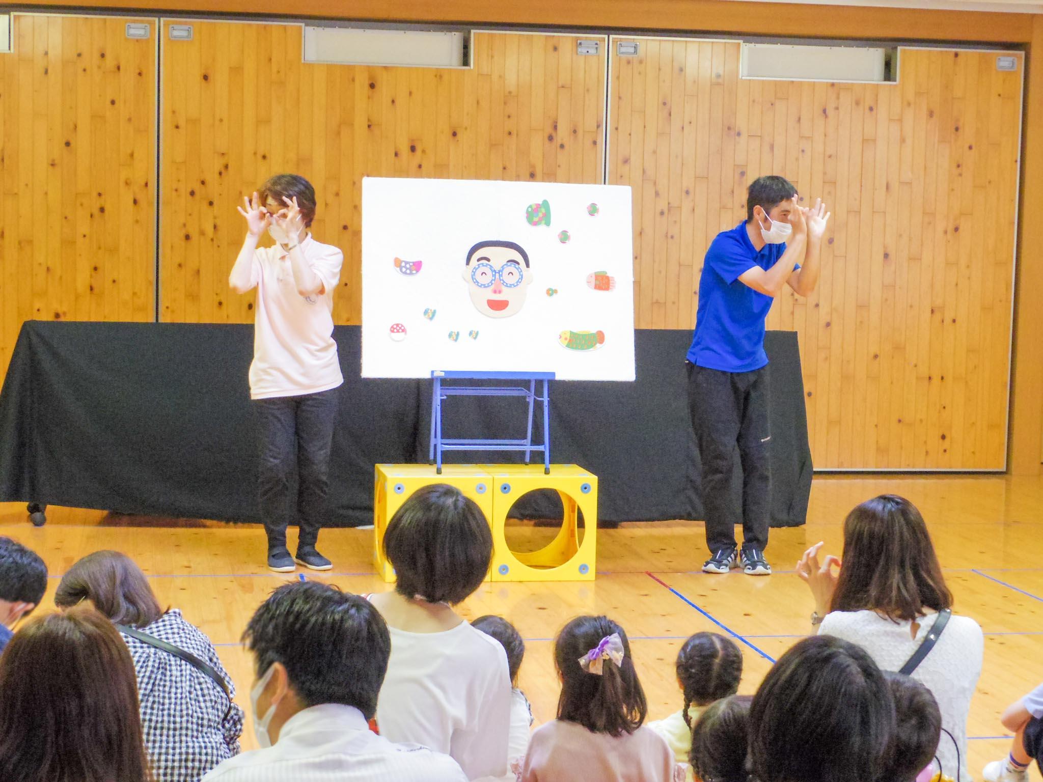 みんなで片付けをしたあとは、遊戯室で、「さかながはねたよ」のパネルシアターを上演しました。魚がくるりと身をひるがえして、帽子やマスクなど身近なアイテムに変身します。最後は、手袋ダンスや「グーチョキバイバイ」の歌を歌い、幼稚園で毎日しているさようならのごあいさつをして終了しました。