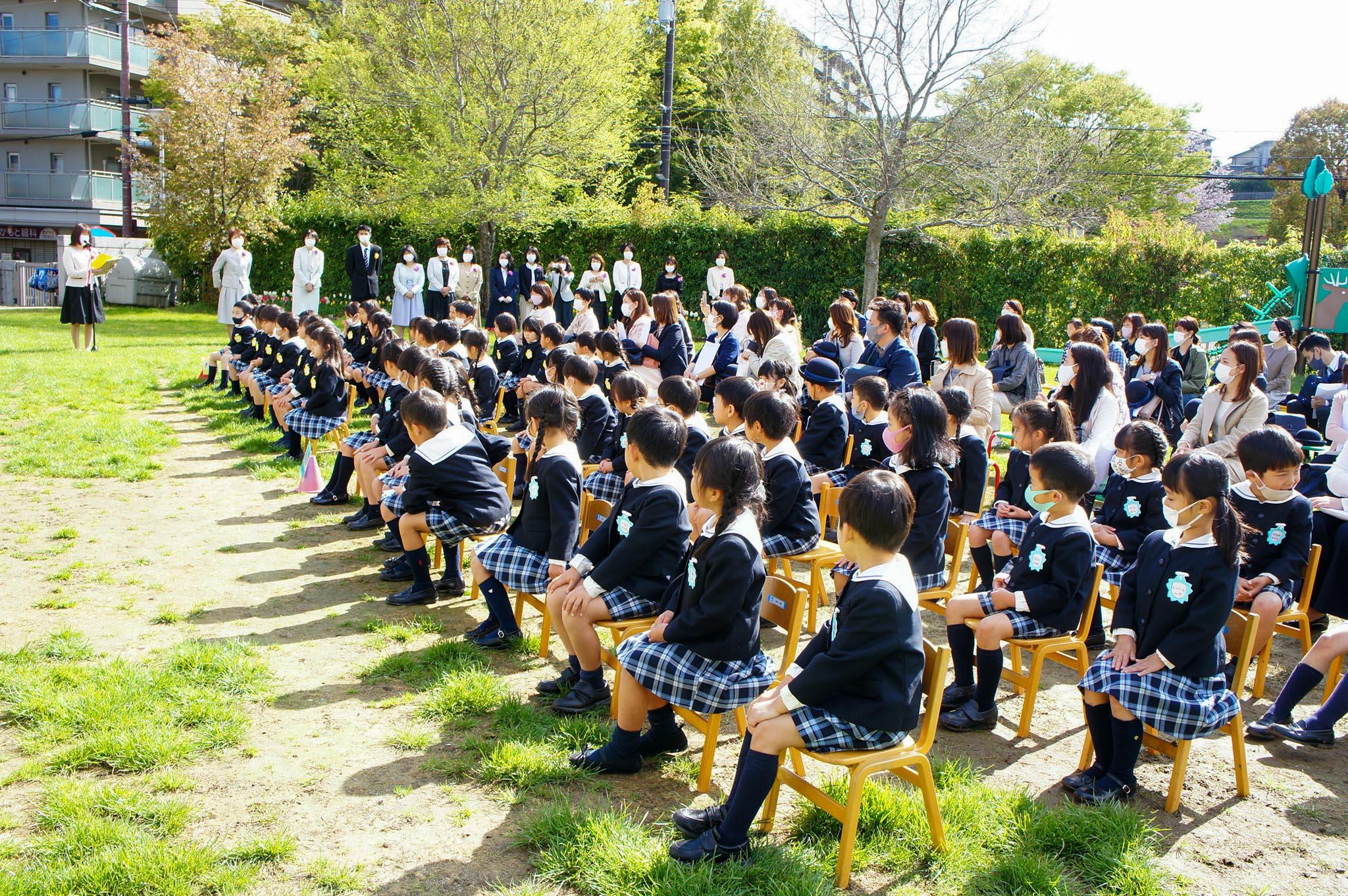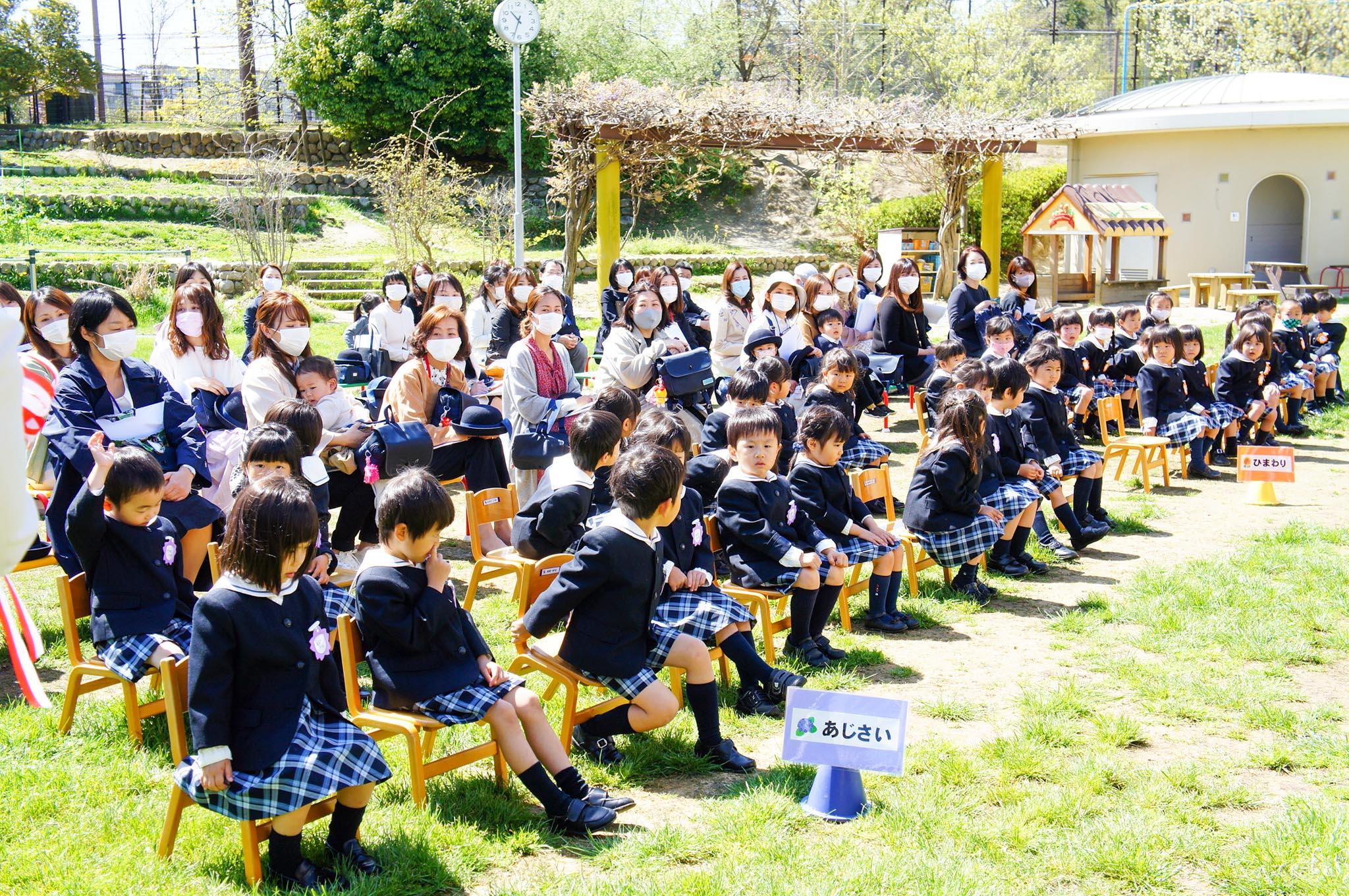 ふかふかの芝生を敷き詰めた園庭で、年長組は9時から、年中組は10時30分から行いました。保護者の方と一緒に登園してきた子どもたちは、久々に会うお友だちとおしゃべりをしたり笑い合ったり。