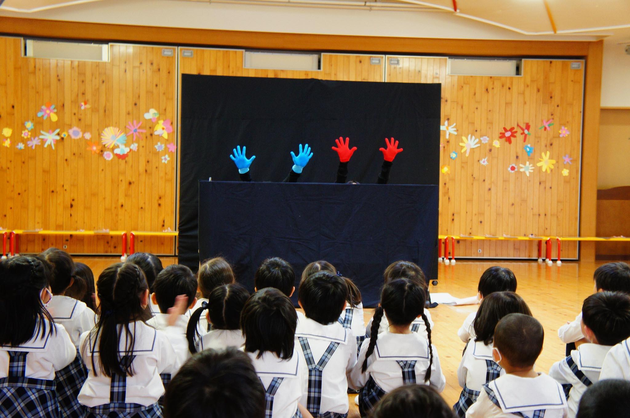 続いて、先生たちから『ドラえもん』のテーマ曲に合わせた手袋ダンスのプレザントがあり、みんな大喜びでした。幼稚園での生活を振り返るスライドをみんなで観ていると、「あっ!あの時、芝生でこけたなぁ」「運動会、おもしろかった」など、映し出された思い出の写真を指差しながら、大いに盛り上がりました。