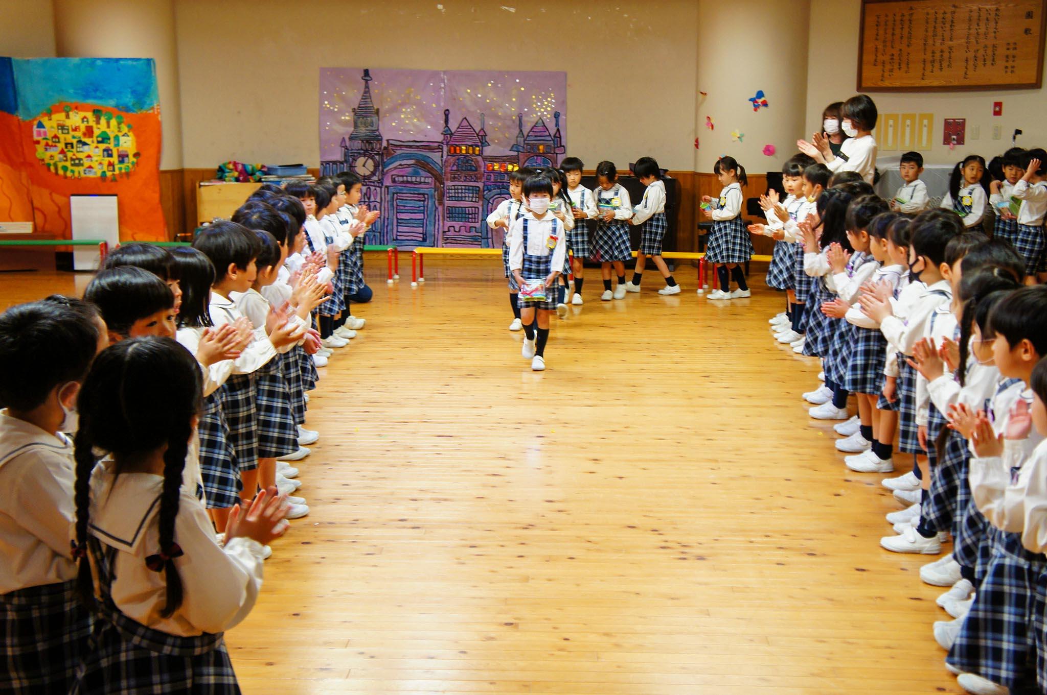 全てのプログラムを終え、年長組さんは年中組・年少組のみんなから「ありがとう」の気持ちを込めたプレゼントを手に花道を通って、退場しました。