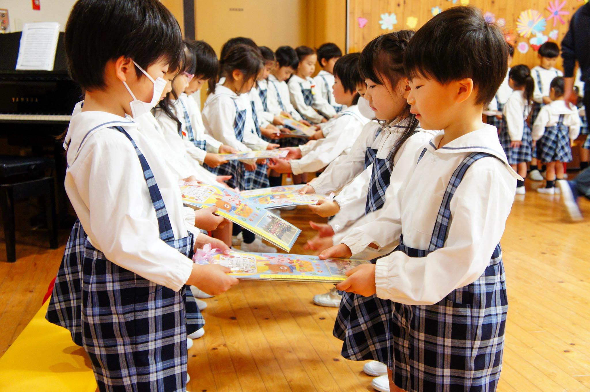 まずは、年少組のみんなとのお別れ会です。年少組の子どもたちから「おにいちゃん、おねえちゃん、いつも一緒に遊んでくれてありがとう。小学校に行ってもがんばってね」という言葉と、「おひさまになりたい」の歌を贈りました。また、お手紙が入った身長計のプレゼントが手渡されました。