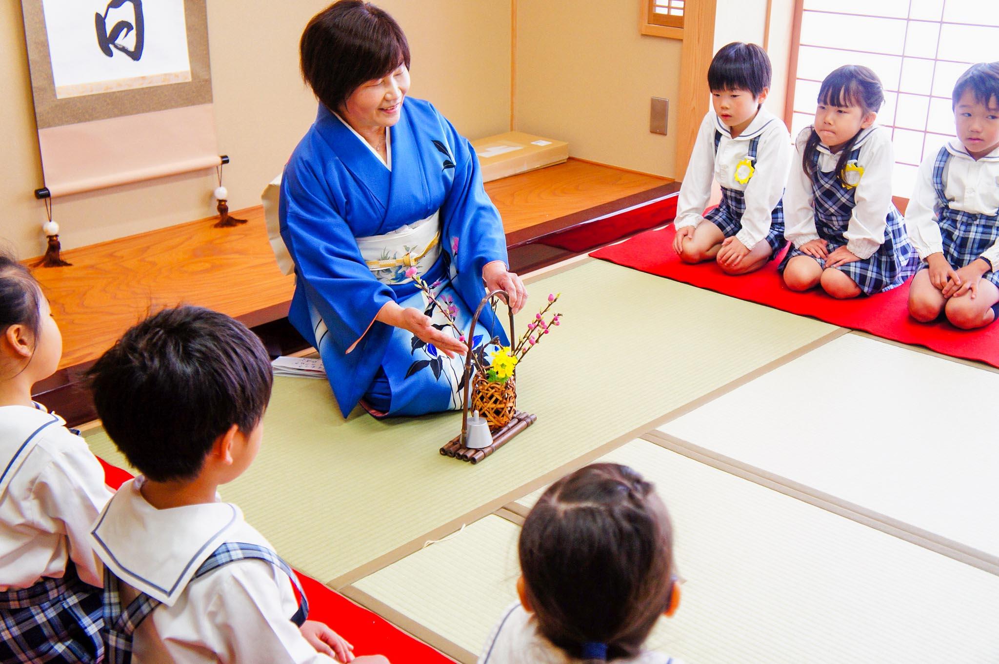 作法室には、ひな祭りにちなんで桃の花と菜の花が生けられています。谷川園長は「3月のことを、日本では”やよい”と言います。『うれしいひな祭り』の歌でも”春のやよいのこのよき日”という言葉が出てきますね。1月は”むつき”、2月は”きさらぎ”と言います」と、12ヶ月間の和風月名と、それぞれの意味を伝えました。