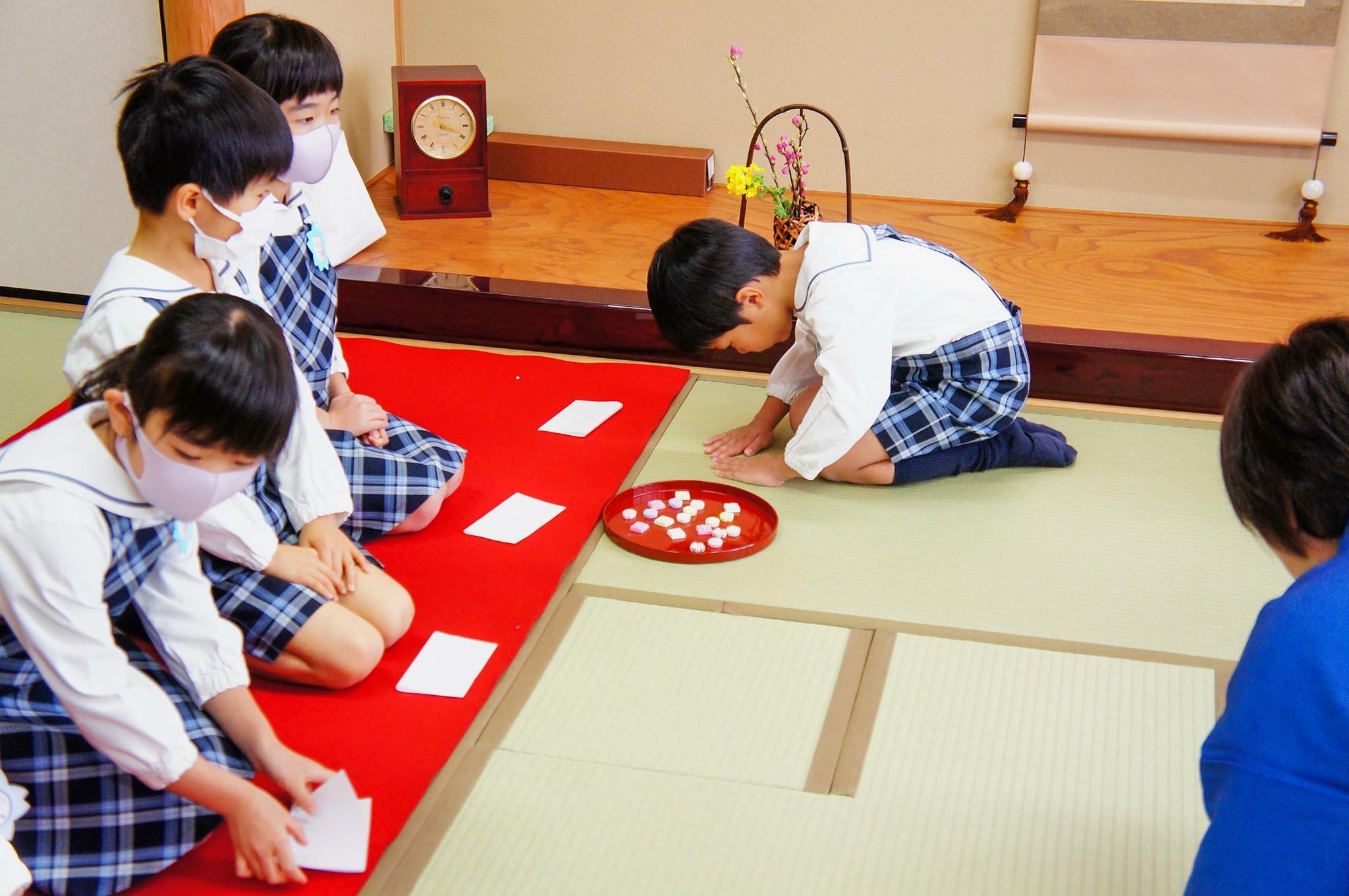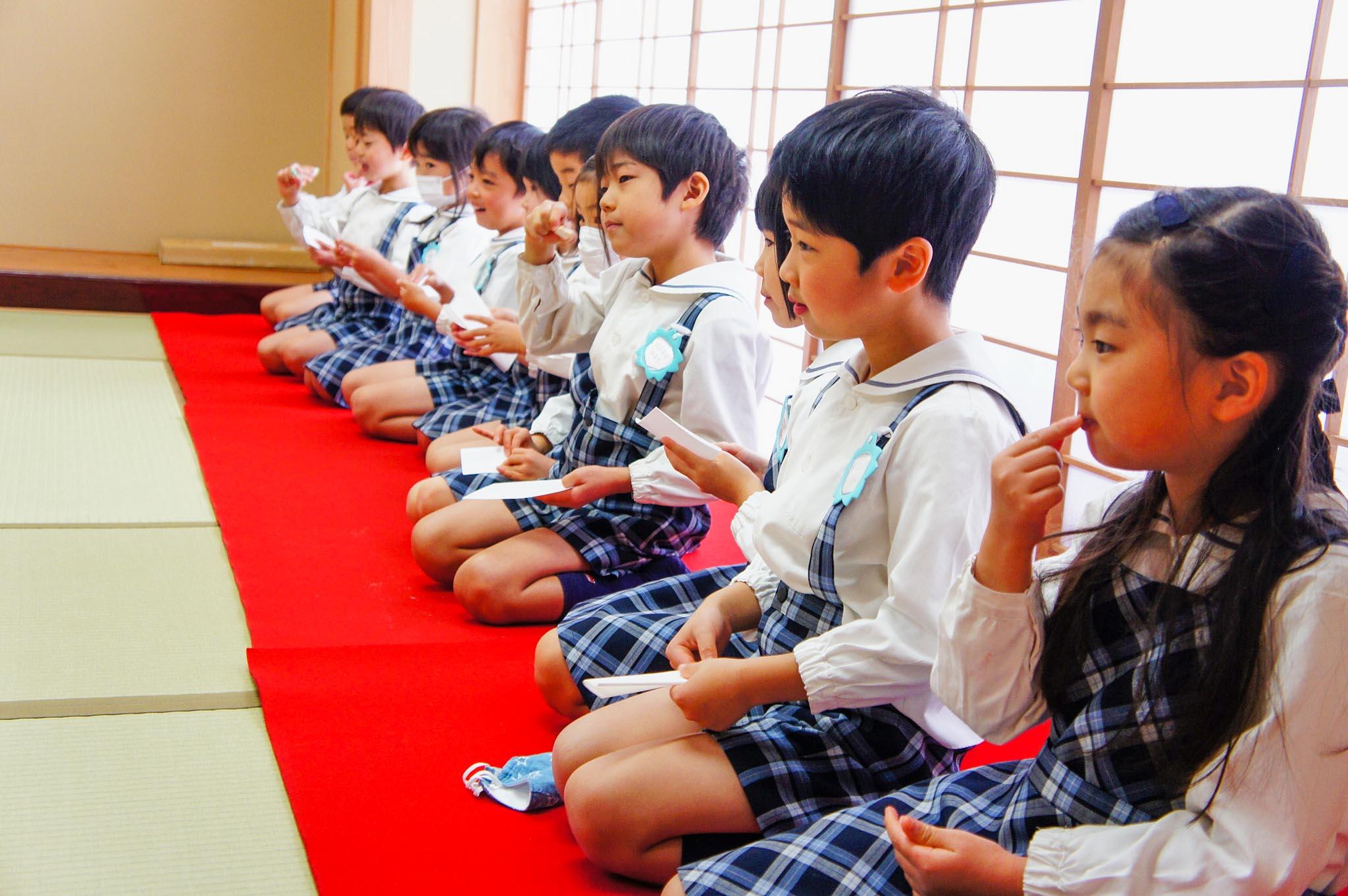 今回の礼法では、お菓子のいただき方を学びました。「お菓子をどうぞ」と隣のお友だちに渡していきます。受け取ったお友だちは「ありがとうございます。お先です」と礼をします。お菓子を口にして、食べ慣れない干菓子の美味しさ、甘さにみんな笑顔になりました。