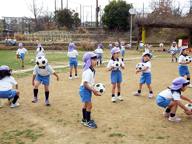 まずは準備体操を兼ねて「空中じゃんけん」で身体を温めると、今回はサッカーボールを使った遊びをしました。上に向けて投げたボールをキャッチしたり、地面にバウンドさせたボールをキャッチしたりしました。次のリフティングやドリブルの練習では、「先生、見て見て!」「もう10回もできたよ!」という楽しい声があちこちから聞こえてきました。上手に練習ができた子には先生がお手製のグリーンカードを出してくれました。