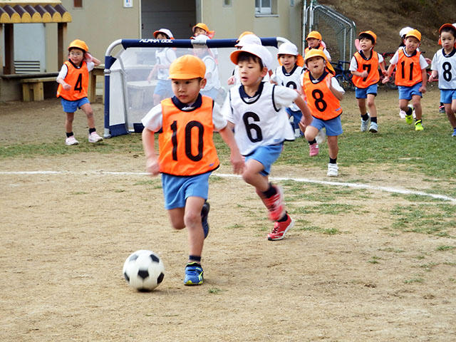 年中児は2チームに分かれての対戦です。夢中でボールを追いかける園児たち、思い切りの良いシュートにゴールキーパーがナイスセーブを見せる場面もあり、白熱した試合になりました。