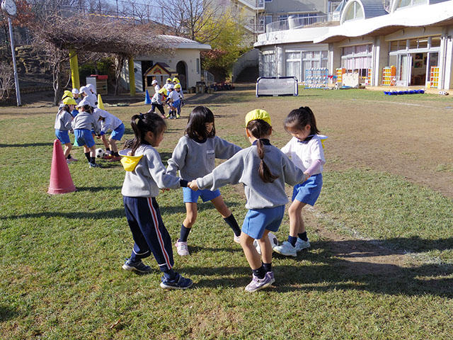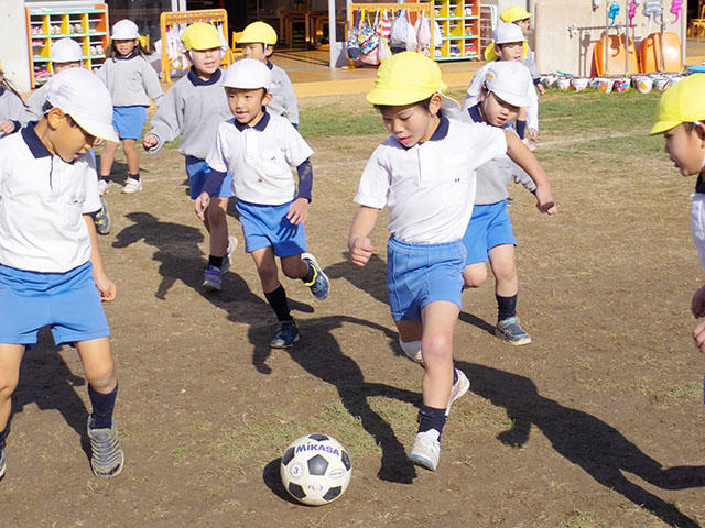 後半は2チームに分かれてサッカーの試合を行いました。みんなでひとつのボールを追いかけるので、思った通りの方向に蹴るのはなかなか難しく、ボールはすぐに園庭のあちこちに転がっていってしまいます。それでも、ゴールを決めた場面もあり、とても白熱した勝負になりました。