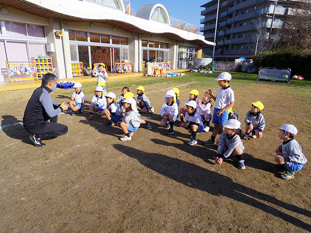 1月15日(金)、奈良学園登美ヶ丘中・高の体育科の先生をお呼びして、今年初めての「体育の先生と遊ぼう」を行いました。今回は年長組が対象で、園庭でサッカーボールを使って遊びます。