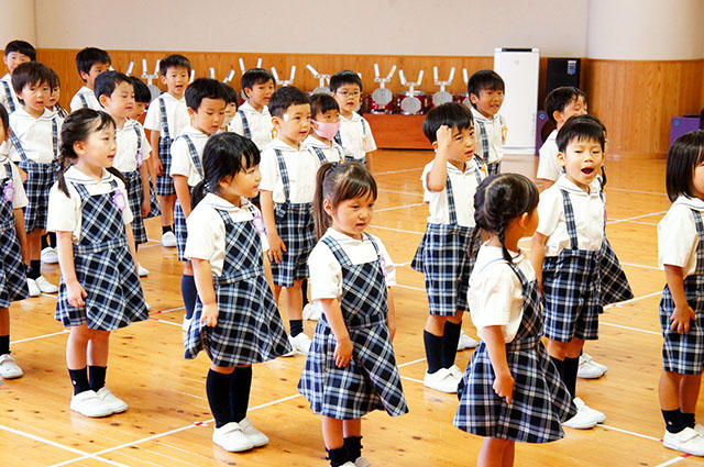 年長組から順に、年中組、年少組が遊戯室へ集合しました。谷川園長のお話と、園歌を歌って、新しい学期の始まりです。