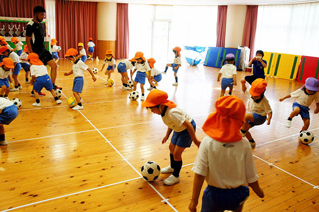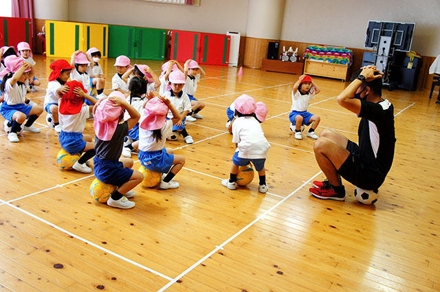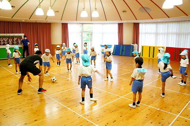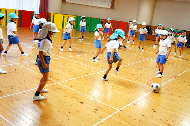年長組の子どもたちは、サッカーボールを両足で挟んで上にジャンプして手で受けるという難しい技に、みんな一生懸命チャレンジし、先生から頑張ったみんなにグリーンカードをいただきました。最後は白組と青組に分かれミニサッカー対戦を楽しみました。