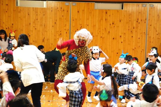 紙芝居が終わり、ふれあい遊びや『まめまきの歌』を歌っていると、低い太鼓の音がどこからか響き、真っ赤な鬼が遊戯室に入ってきました。最初は逃げ回る子どもたちでしたが、どこからともなく福の神が登場するとみんなで一緒に「鬼は〜そと!福は〜うち!」と鬼に豆まきの集中攻撃です。やがて頭を抱えた鬼は遊戯室から逃げていきました。無事鬼を退治し、みんなは手をあげて大喜びでした。