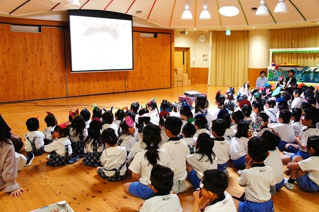 谷川園長のお話しの後、なきむし鬼とおこりんぼう鬼とねぼすけ鬼が登場する紙芝居『おにわーそと!』を、みんなで見ました。紙芝居の中の鬼に向かい、大きな声で「おにわーそと!」と言うと、物語の中で鬼が逃げていきました。先生からは「みんなの中にいる鬼も、豆まきをして追い出そうね」と話がありました。