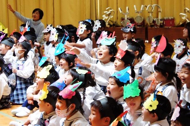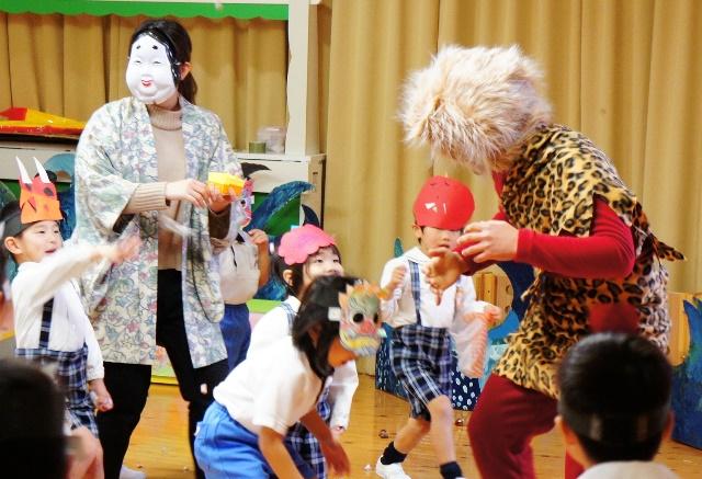子どもたちは手作りの鬼のお面をつけてワクワクしながら遊戯室に入ってきました。