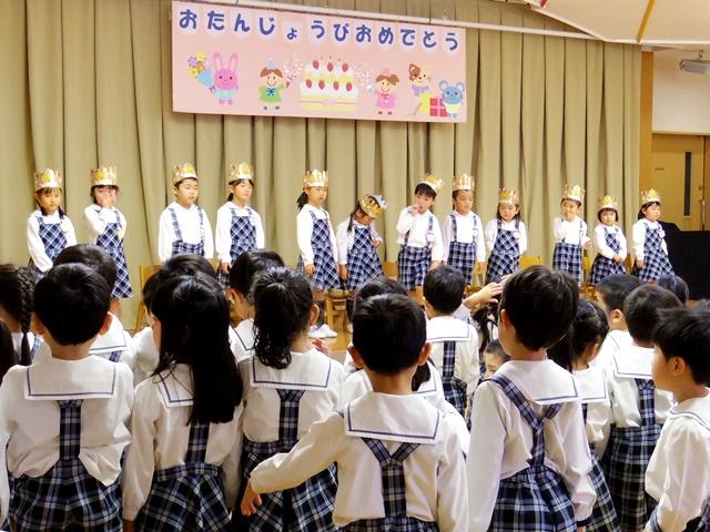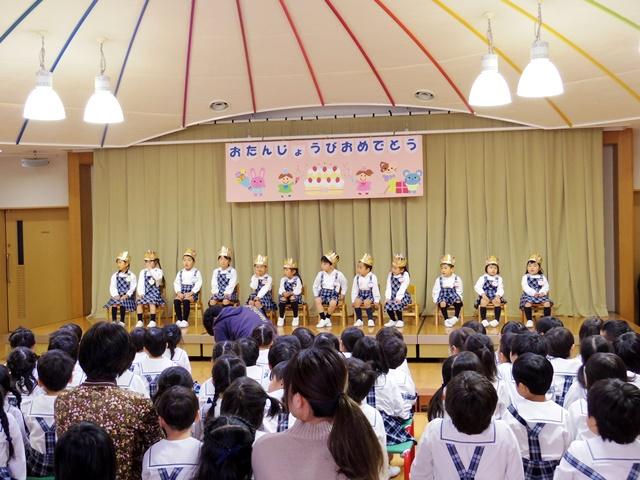 はじめに、1月生まれのお友達12名が冠をつけて舞台に上がりました。一人ひとりクラスと名前、年齢をみんなの前で発表したあと、『ハッピーバースデートゥーユー』をうたいお祝いしました。
