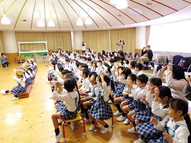 谷川園長のあいさつの後は、みんなで『拍手をプレゼント』の歌をうたい、おめでとうの言葉を贈りました。1月にお誕生日を迎える子どもたちの保護者の方々からは『いとまきのうた』の手遊びをプレゼントしてくださいました。