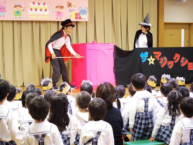 続いて、先生たちからマジックショーのプレゼントです。先生が順に手品を披露し、最後には大きな箱を使った消失マジックを披露しました。大いに盛り上がり1月のお誕生会を終えました。