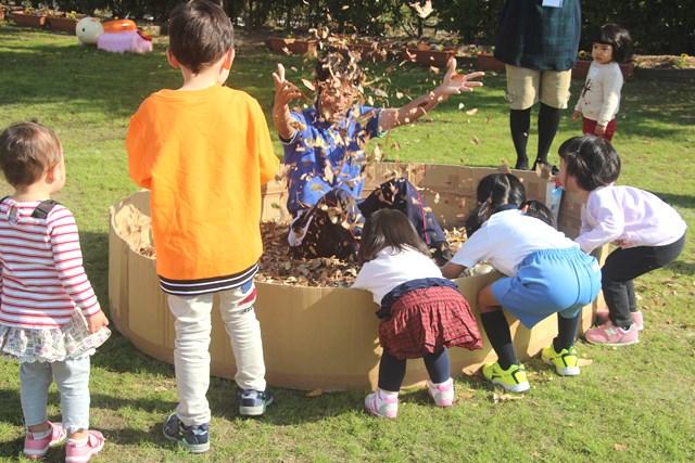 「秋を感じて遊びましょう」をテーマに、園庭に設置したトンネルや落ち葉のプールを使い、自由な遊びを楽しみます。保育室では、おままごとやどんぐりを使ったマラカスの制作など様々な遊びを楽しんでもらいました。