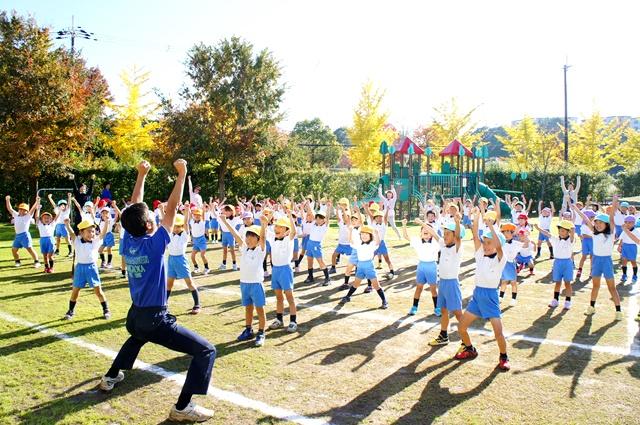 秋の真っ青な空の下で、まずは全園児が園庭で「うきうきタイム」です。体育の先生の動きに合わせ、飛んだり跳ねたり走ったり。「猛獣狩り」ゲームでは、それぞれのチームの人数を合わせるために、他の先生だけでなく、お父さんやお母さんも、子どもたちに手を引っ張られて参加していました。