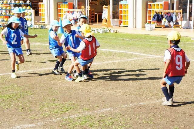 続いて年長児は登美ヶ丘中高教諭による「体育の先生と遊ぼう」で、サッカーをしました。