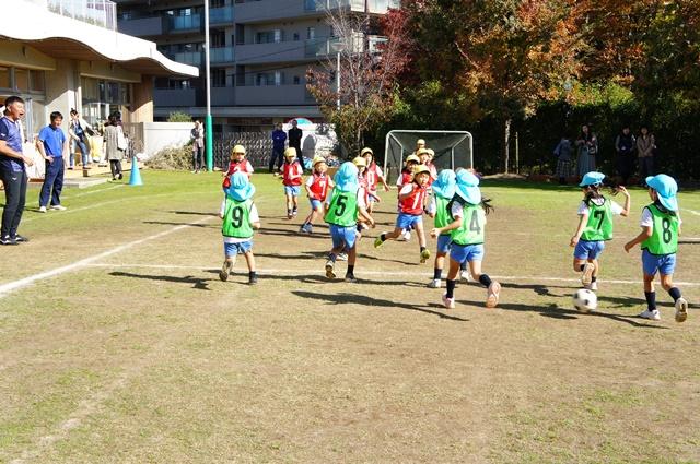 サッカーの基本からはじめ、インサイドドリブルから走りながらのドリブルと、だんだん難しい技にチャレンジです。後半は、ゼッケンをつけてミニゲームです。上手なプレイに先生からグリーンカード、反則をすればイエローカードです。4チームに分かれ、加減のない激しい試合展開に、先生からも「すごいな!みんなグリーンカードやな」という言葉をいただきました。