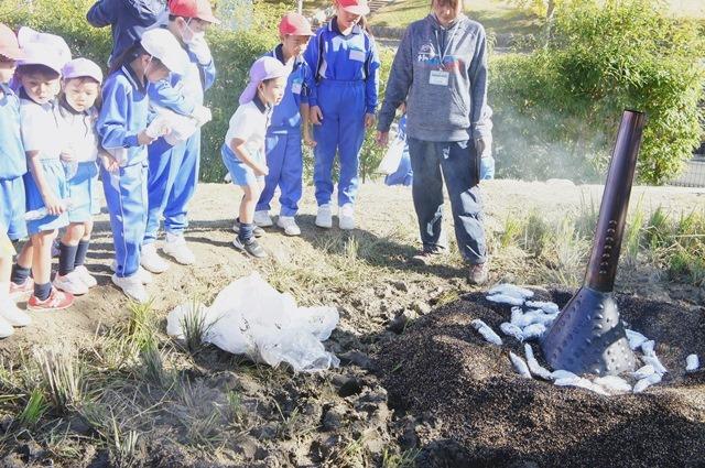 また、棚田の方では年中児が奈良学園小学校の児童と一緒に、焼き芋づくりをしました。その後、焼き芋が焼き上がるまで、小学校のお兄さんやお姉さんたちと遊戯室で楽しいゲームをして遊びました。