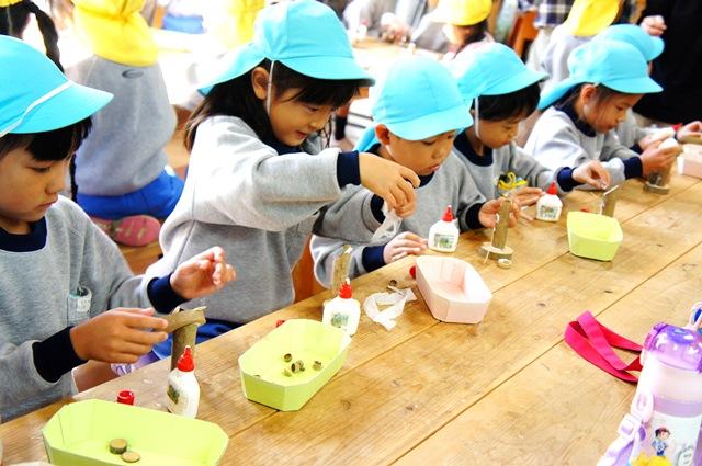 森の散策を終えて森の工作館に戻った子どもたちは、自然の材料を使った工作をしました。輪切りにした木材に、どんぐりやさまざまな種、木の皮、小枝など貼り付けていきます。迷いながら選んだ材料で、思い思いに作品を完成させました。